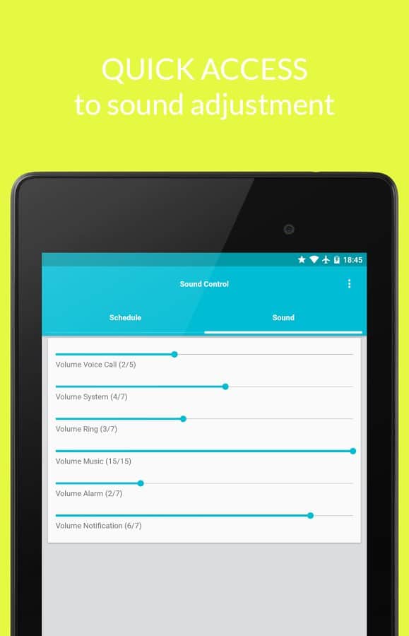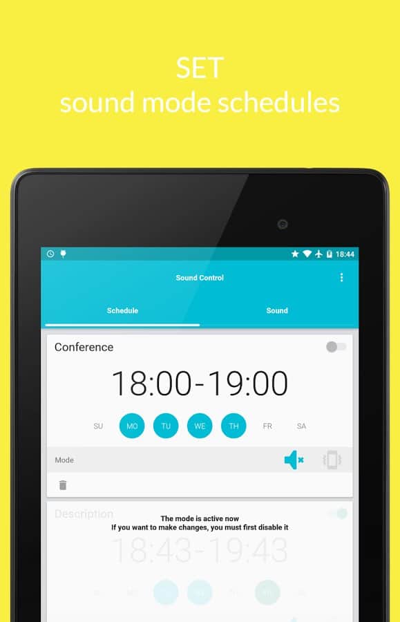 A menudo sucede que configuramos un modo específico en nuestro teléfono inteligente o tableta en momentos regulares. Y cada vez nos vemos obligados a ajustar las mismas configuraciones. O, aún más a menudo, al activar, por ejemplo, el modo silencio, olvidamos desactivarlo y perdemos llamadas importantes. Para evitar tales inconvenientes y no gastar mucho tiempo en las mismas acciones, puedes utilizar la aplicación proporcionada. Esta permite ajustar de manera flexible y extremadamente precisa todas las configuraciones de audio en el dispositivo, activar y desactivar la configuración a tiempo, y así ahorra mucho tiempo al propietario. La interfaz de la aplicación se ve simple y, gracias a Material Design, es moderna.
