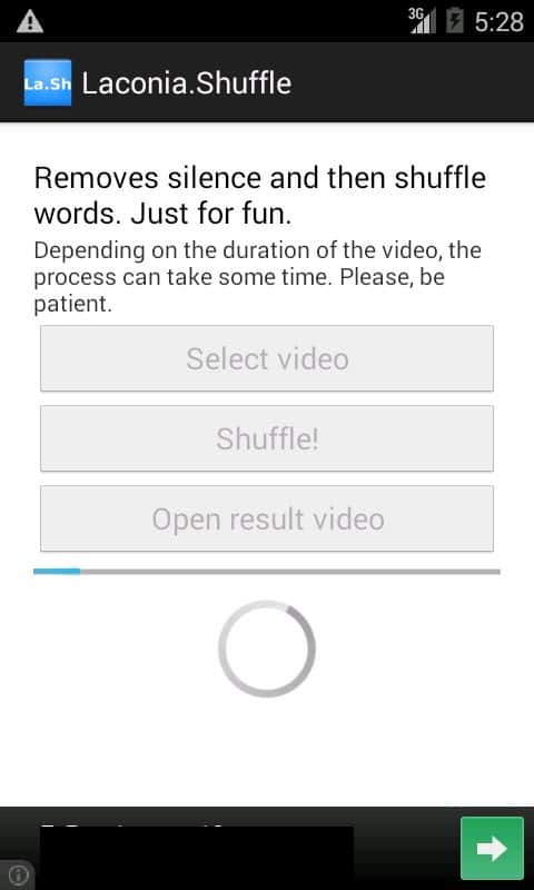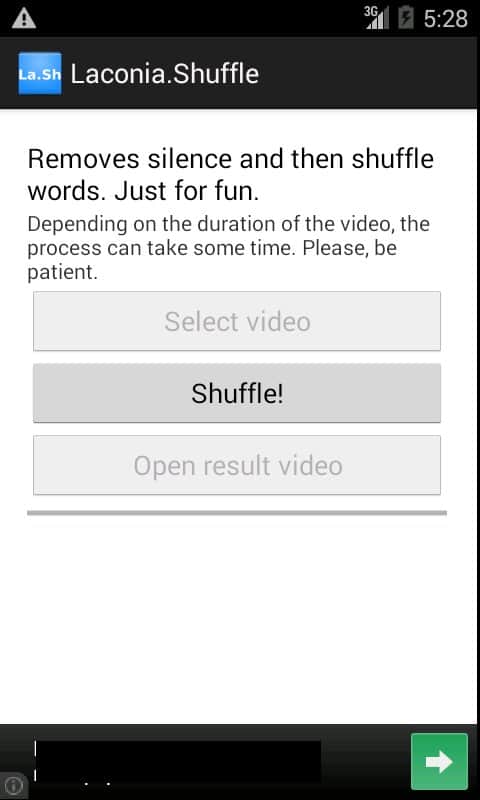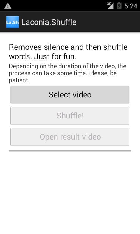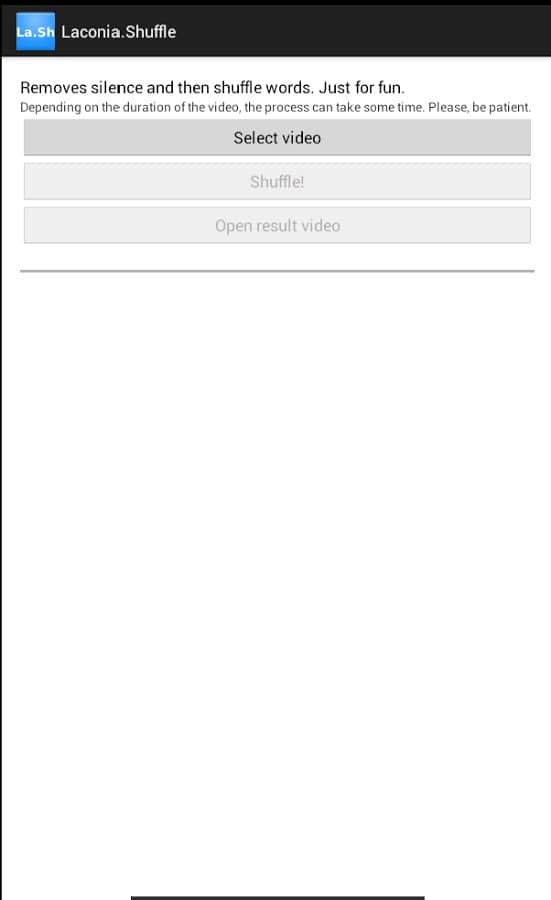 Laconia.Shuffle – aplicación para que los aficionados experimenten con grabaciones de video del desarrollador NIKNAMELOGIN para Android. Con este programa no solo puedes eliminar el silencio en el video (vale la pena mencionar que esto se hace automáticamente), sino también realizar una serie de efectos diferentes, como pronunciar las palabras al revés o mezclar todas las palabras. Uno de los aspectos destacados del programa – es el hecho de que el video se procesa directamente en tu dispositivo sin necesidad de cargarlo a Internet, lo que hace que tu archivo de video sea tuyo. ¡Disfruta y buen ánimo!