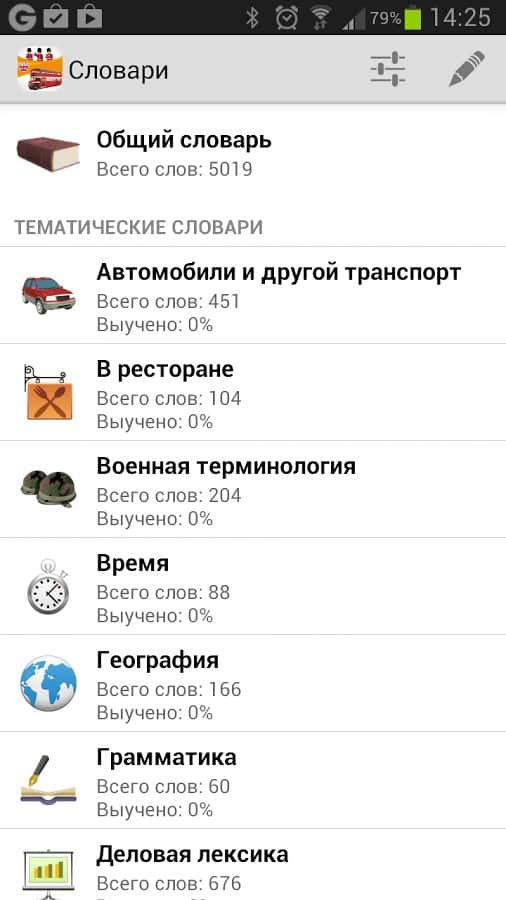 También están disponibles 30 diccionarios especializados (Comida y cocina, Medicina, Vocabulario de negocios, Animales, etc.) que puedes utilizar para pasar la capacitación con éxito. Tienes la capacidad de crear tus propios diccionarios temáticos, añadiendo tus propias palabras o seleccionándolas del vocabulario común.