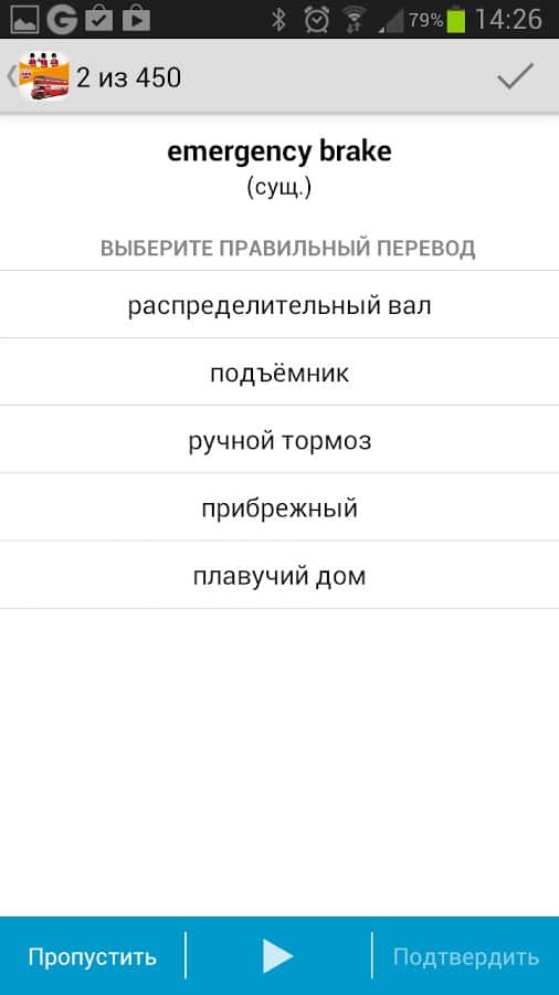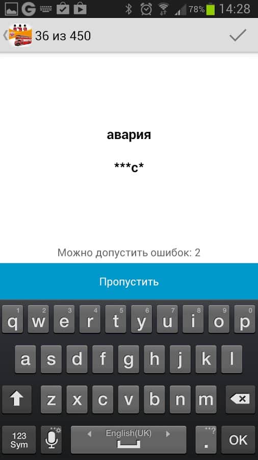 Un sistema de entrenamiento muy conveniente (basado en el sistema de repeticiones espaciadas con tarjetas de Leitner) te permitirá recordar palabras en inglés de manera eficiente y fácil. En el programa hay 4 opciones de ejercicios para elegir: "Traducción al ruso", "Traducción al inglés", "Dictado" y "adivina la palabra"