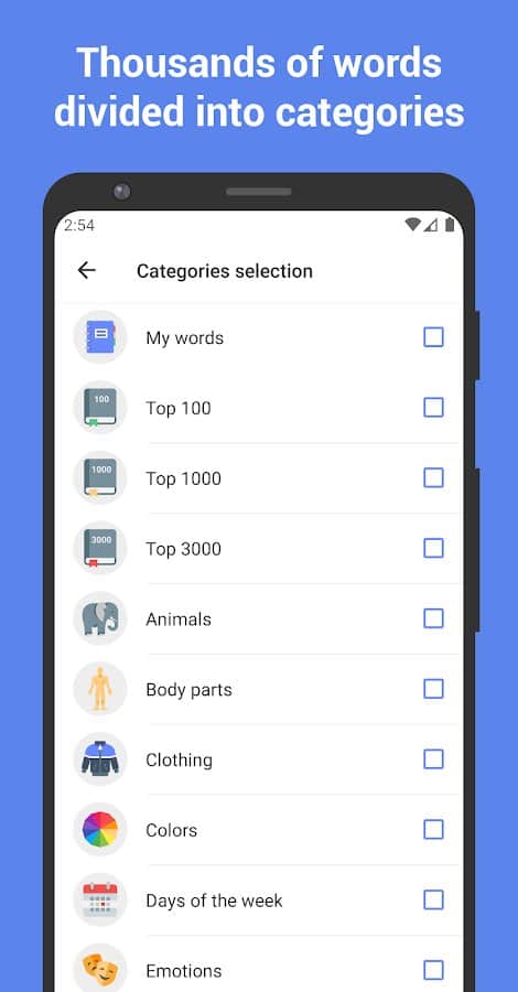 - Memorización efectiva: Ejemplos de uso y un algoritmo inteligente te ayudarán a memorizar rápidamente y de forma permanente nuevas palabras.