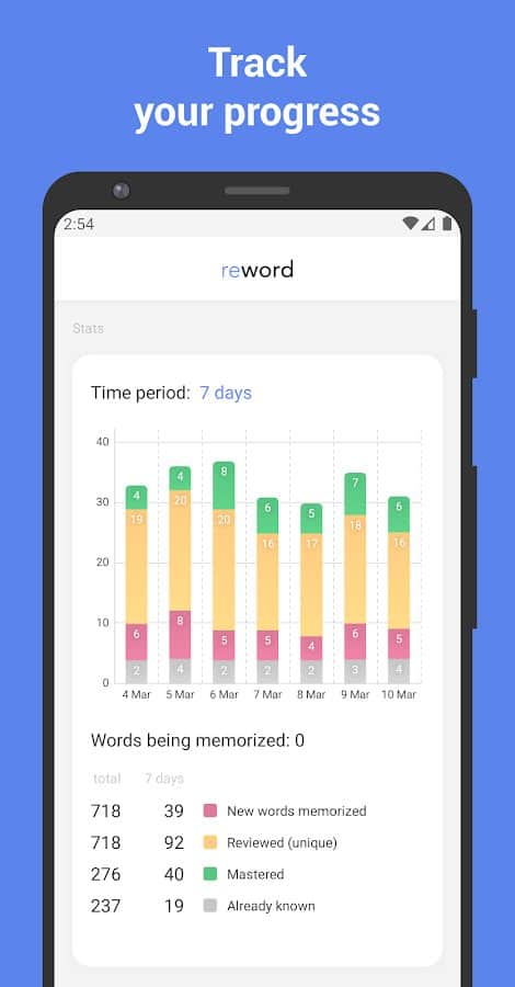 - Estadísticas de aprendizaje: Rastrea el progreso durante una semana, un mes, tres meses y un año.
