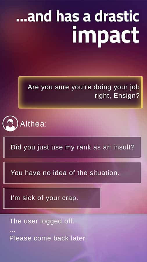 Loop – La llamada de auxilio – es un emocionante juego con varias opciones para el desarrollo de la trama, que dependerán de tus decisiones, comportamientos, acciones y relaciones con su personaje. Después de recibir la señal de auxilio, eres el único héroe que puede salvar a la tripulación. La teniente Althea intentará ayudarte y guiar tus conclusiones y suposiciones. Ten en cuenta que la notificación que recibirás será tu guía en el camino para enfrentar los desafíos que se avecinan. La historia se desarrollará en formato de Thriller y estará acompañada de música emocionante y creativa. ¡Podrás expresarte en tiempo real para sumergirte en el maravilloso mundo de la ciencia ficción!