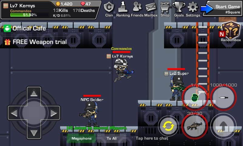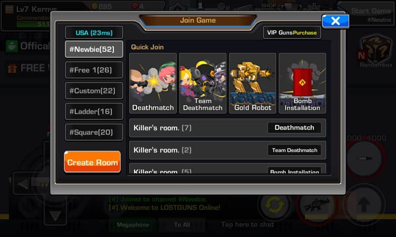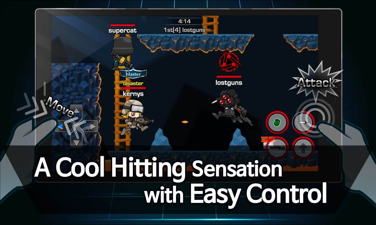 LOSTGUNS: Tiroteo Multijugador – shooter en línea para Android, en el que puedes jugar con tus amigos. En este juego tomarás el control de un héroe valiente y lo llevarás a través de varios niveles, luchando contra muchos enemigos. Lleva a tu héroe hacia adelante a través de mundos en 2D y comunícate en un chat común con tus amigos. El juego puede jugarse con hasta ocho personas en tiempo real. Corre, salta y dispara continuamente al enemigo, sin darles ninguna oportunidad de ganar. Controla a tu héroe y disfruta de los controles simples y utiliza las bombas, colocándolas en diferentes lugares y dispara con un rifle.