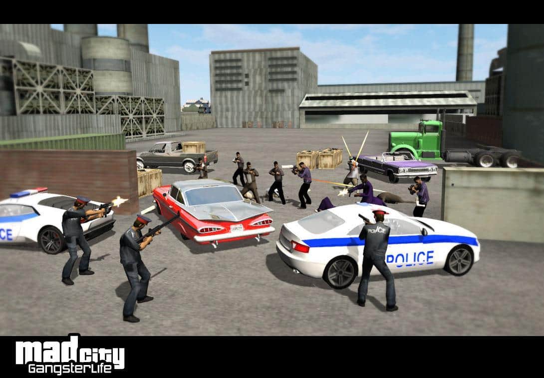 Mad City: Vida de gánster - el juego intenta en parte copiar la famosa serie de juegos GTA, incluso las fuentes en las imágenes son similares. Pero el juego está realmente lejos de ser un juego de culto de Rockstar. Pero si tienes un deseo excesivo de ver algo nuevo, entonces puedes intentar este juego. La gráfica es mediocre, pero se puede jugar. Ciudad abierta, persecuciones de coches, tiroteos, coches geniales, conducir en la gran ciudad, ¿qué podría ser más divertido e interesante? Los enfrentamientos en el juego son comunes, así que no olvides comprar mucha munición y no olvides que la policía está lista para encerrarte.