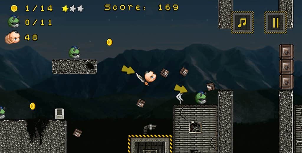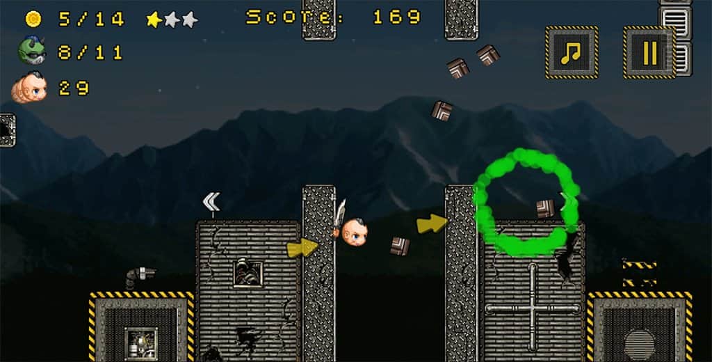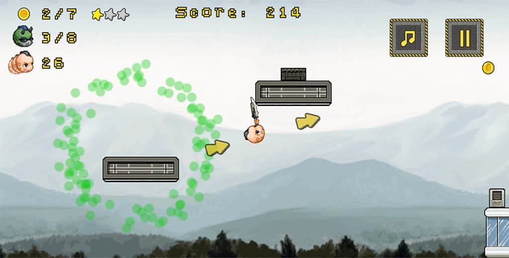 Mad Heads – un plataformas dinámico para Android, donde controlarás a un personaje divertido. Este juego simple pero único donde controlarás a un personaje divertido y lo guiarás hacia el lado correcto, destruyendo a todos los enemigos que se interpongan en el camino. Destruye y derriba las cajas que se encuentren en tu camino y utiliza la función de dilatación del tiempo, que te ayudará a elegir la trayectoria de vuelo deseada y destruir a todos los enemigos. Para pasar al siguiente nivel, necesitas matar a todos los enemigos y liberar a tu amigo de la cautividad.