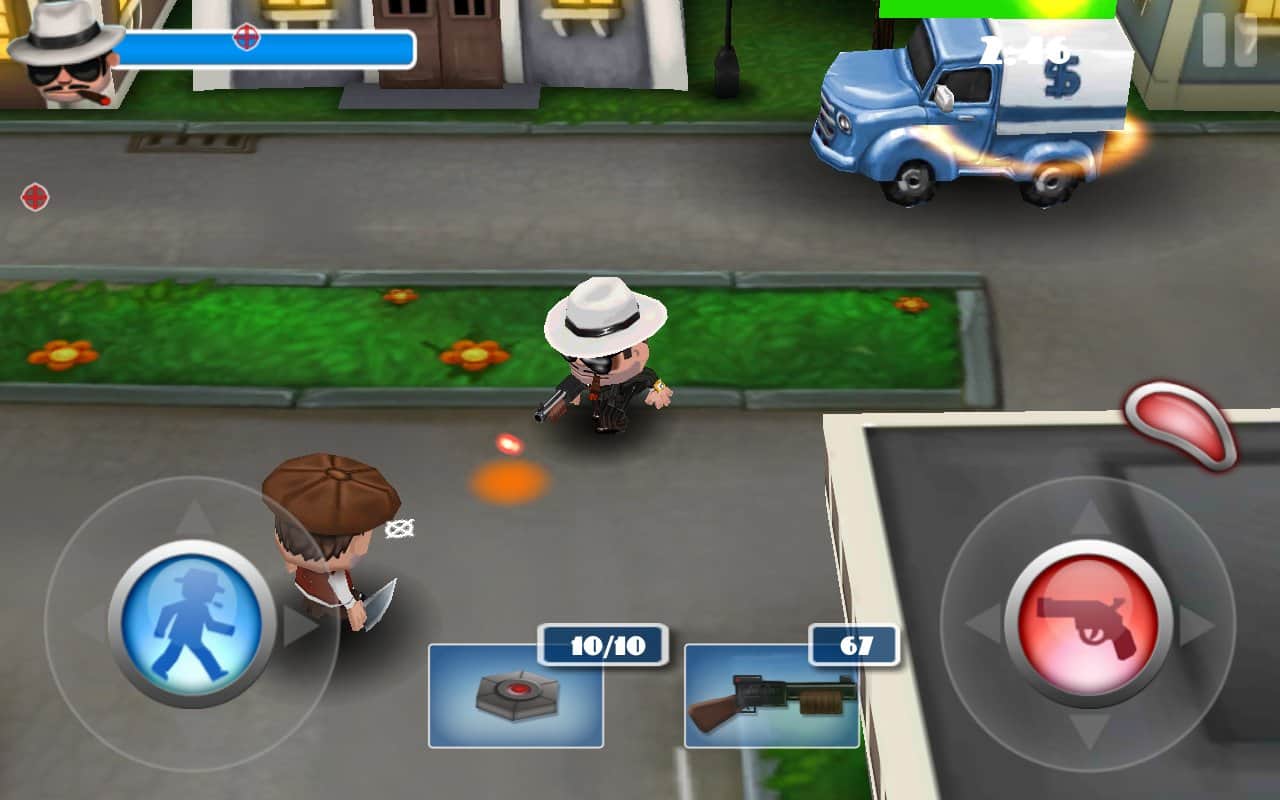 Mafia Rush – shooter de mafia para Android manejado con dos dedos, un dedo mueve al héroe y el otro dirige la mira. El objetivo del protagonista, como cualquier gánster, es robar bancos sacando sacos llenos de dinero, ¡luego protege esos sacos, que son casi tu riqueza!