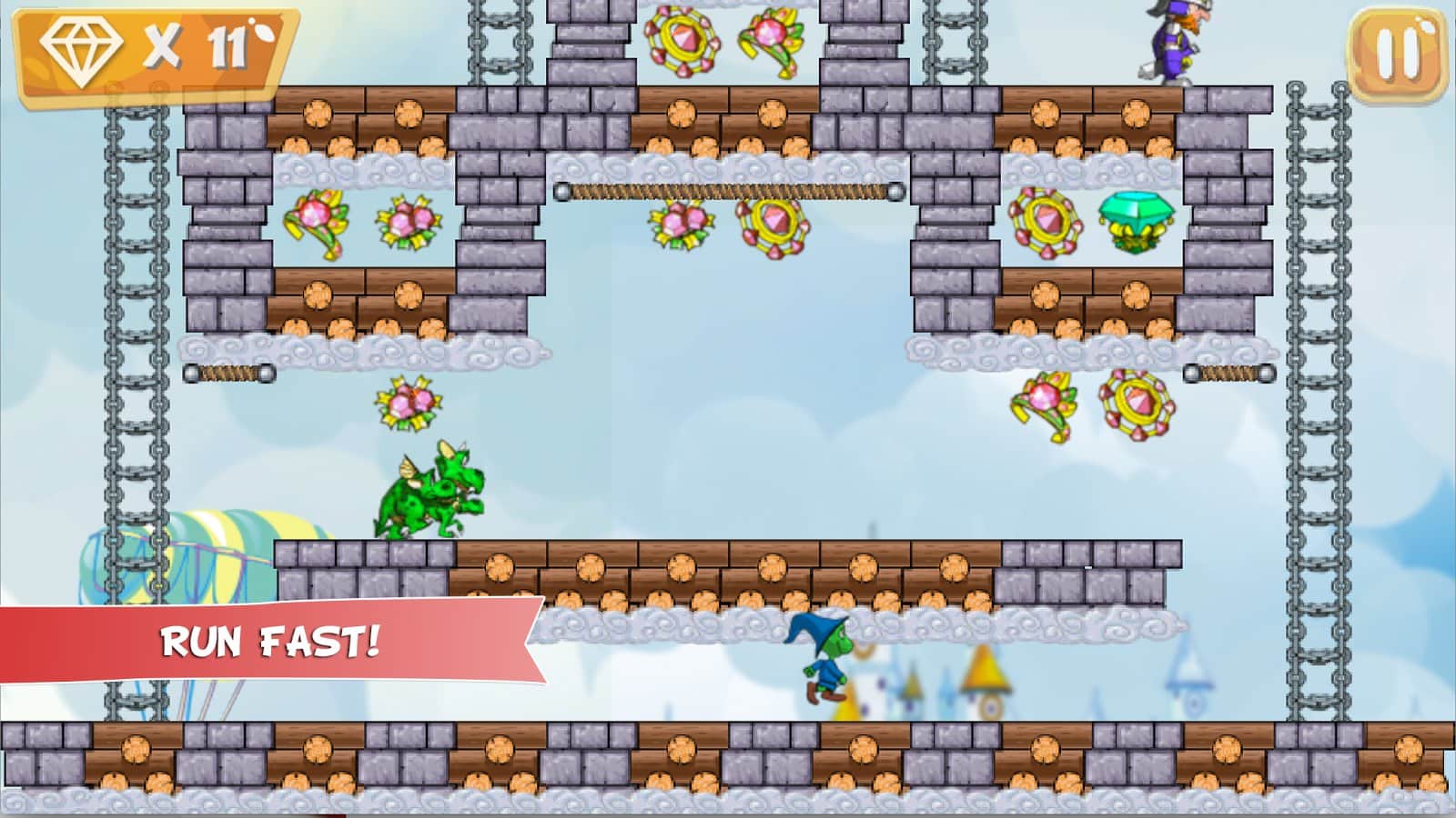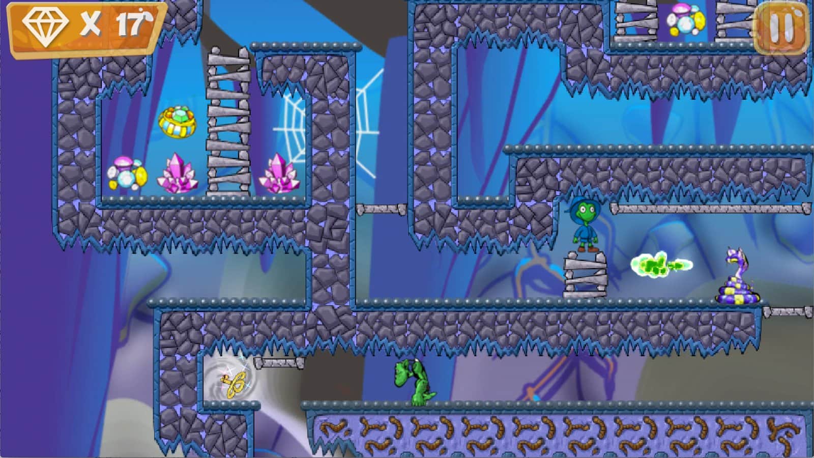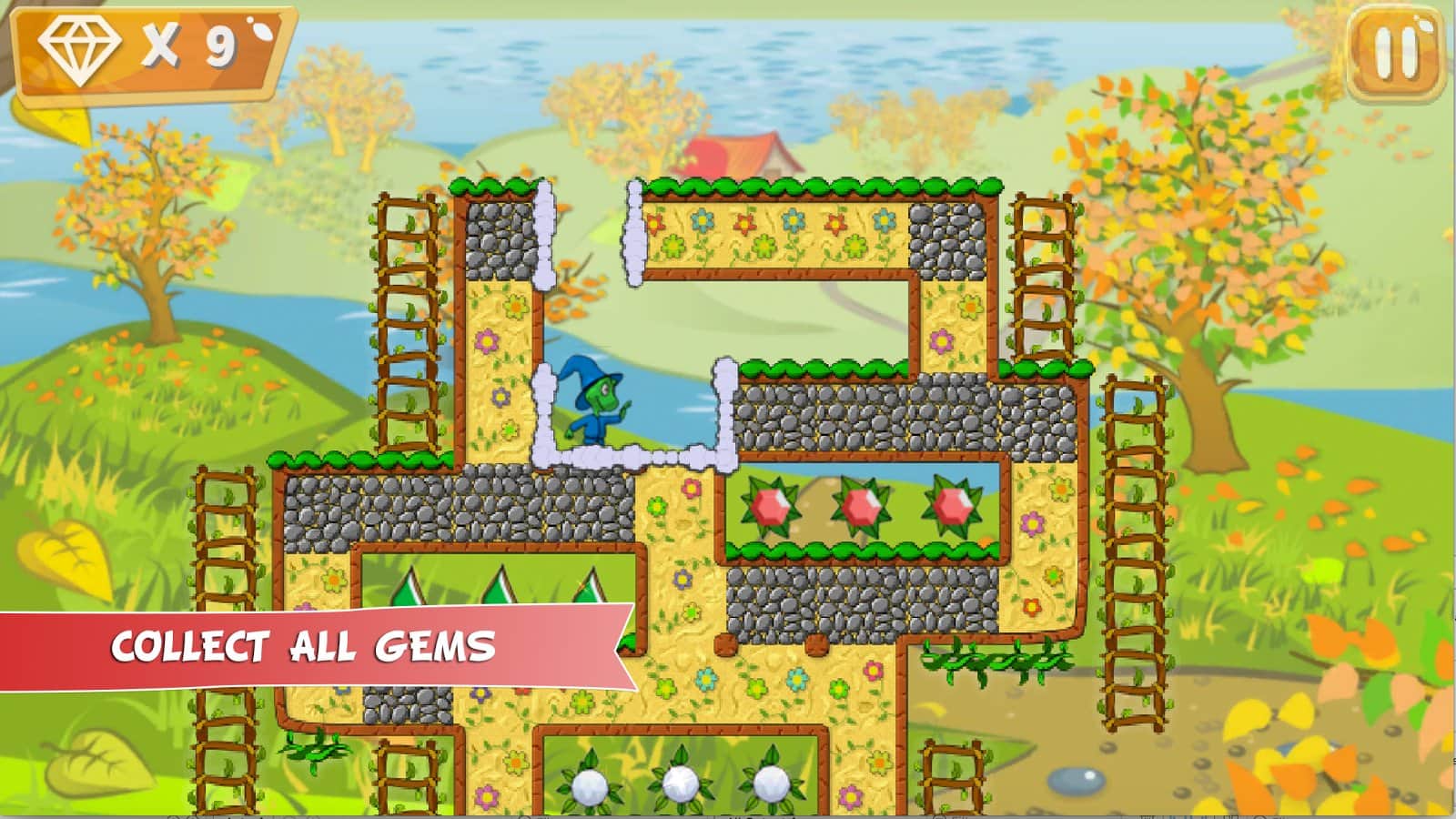 Magus: en busca de aventura – guía al divertido héroe que está decidido a encontrar el tesoro. Nuestro héroe Magus casualmente estaba en el nuevo mundo y regresó usando un portal mágico. Y ahora debe volver a casa y encontrar tesoros ocultos. Explora el mundo que te rodea y busca el camino más corto que te llevará al tesoro. Sigue la ruta de los antiguos mapas y navega a través de las plataformas, arrástrate por las vides, salta y evita trampas y obstáculos. Lucha contra plantas carnívoras y otros oponentes inusuales y completa los 90 niveles del juego.