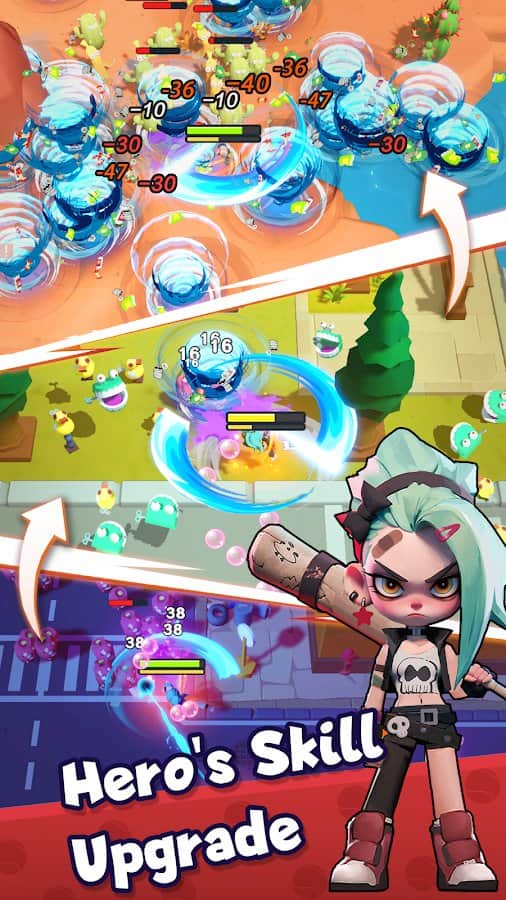- Héroes únicos: Mejora a tus personajes, desbloqueando nuevas habilidades y objetos.