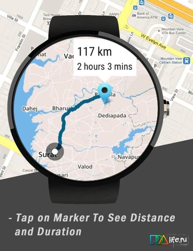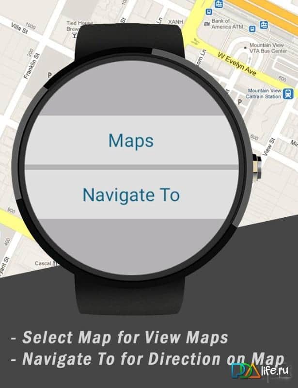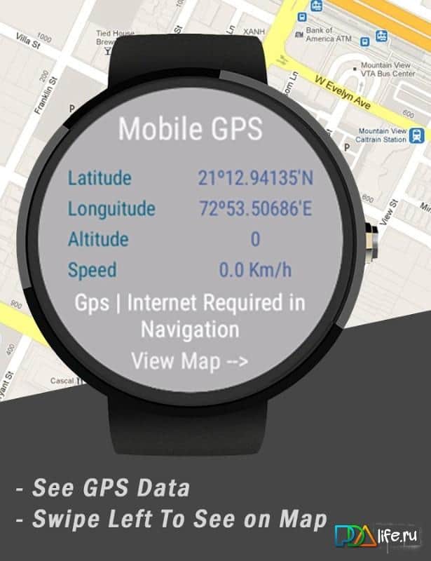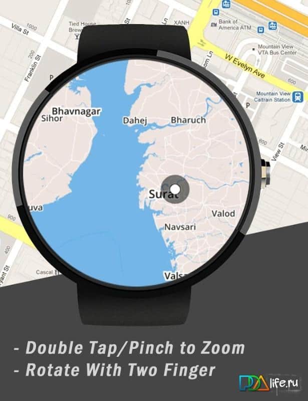 Una buena solución a este problema es trasladar el navegador del smartphone a la muñeca, es decir, a los relojes con Android Wear. La aplicación presentada no tiene nada que envidiar a los navegadores completos: permite ver el mapa, muestra tus coordenadas y velocidad de movimiento, calcula la distancia hasta un punto determinado y hace pronósticos sobre el tiempo que tomará. El mapa en la pantalla se puede ampliar y rotar con gestos habituales.