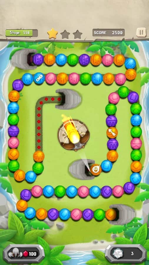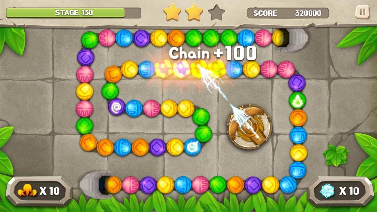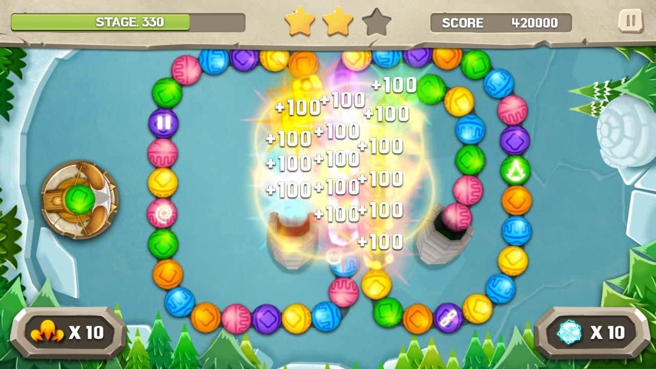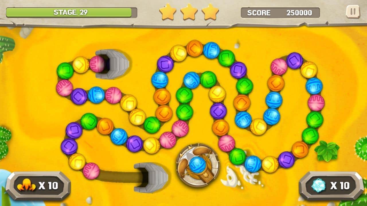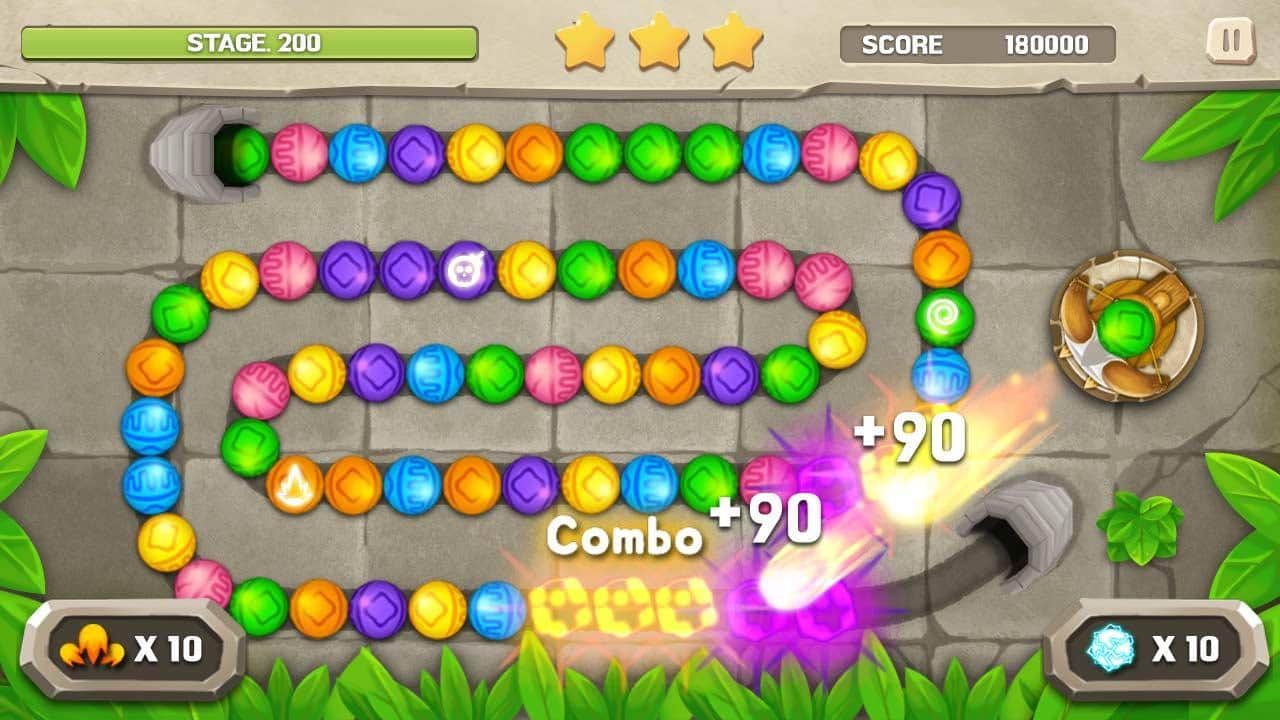Misión de canicas – un juego para Android, muy similar al clásico juego Zuma. En este juego, al igual que en su versión original, necesitas disparar bolas de colores a una cadena en movimiento y hacer ataques combinados. Conecta tu lógica y la destreza de tus dedos para hacer que una bola se una al grupo de bolas del mismo color y hacerlas explotar. Cuantas más explosiones realices, más lenta se moverá la cadena o detendrá completamente su movimiento. Usa los bonos y completa todos los niveles del juego.