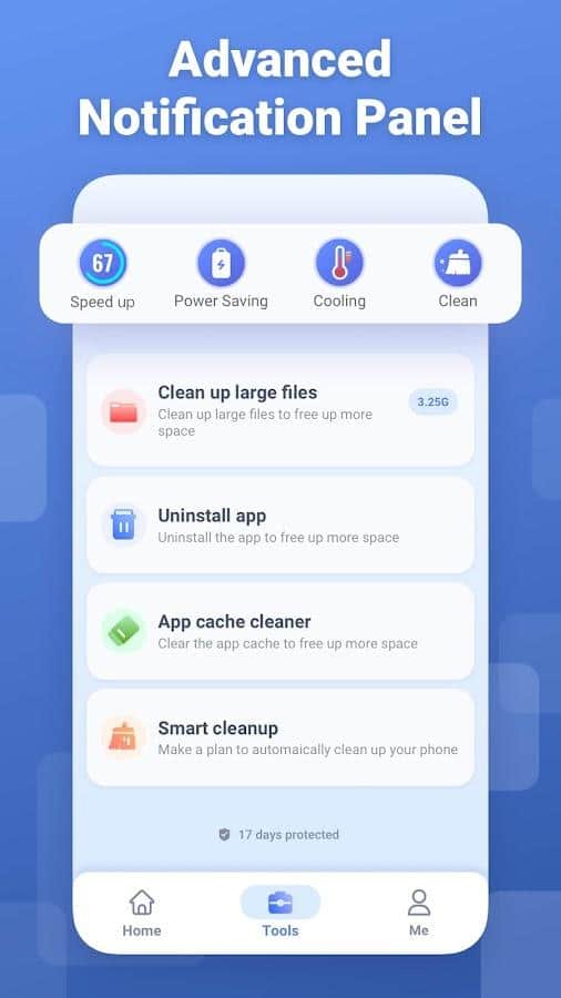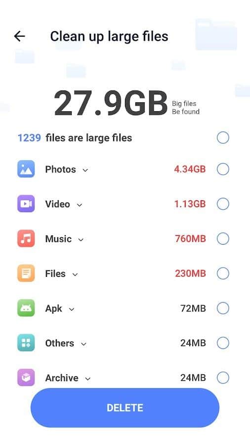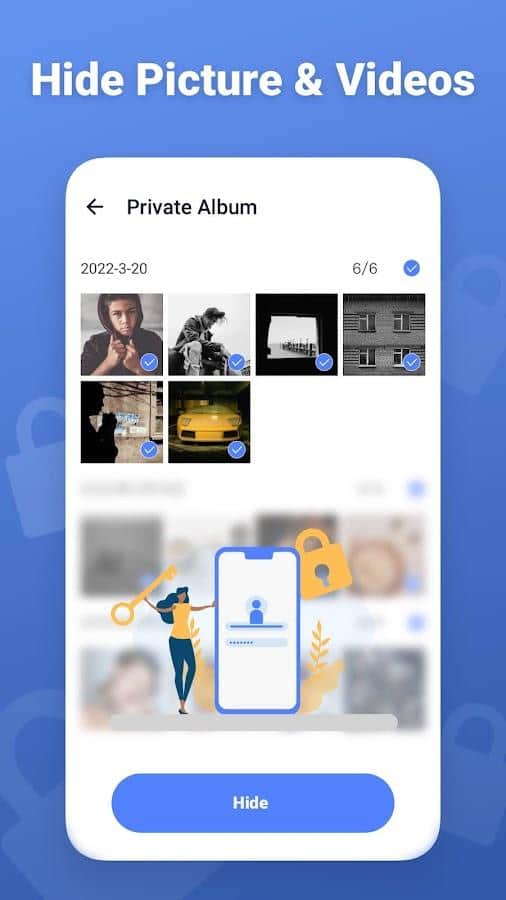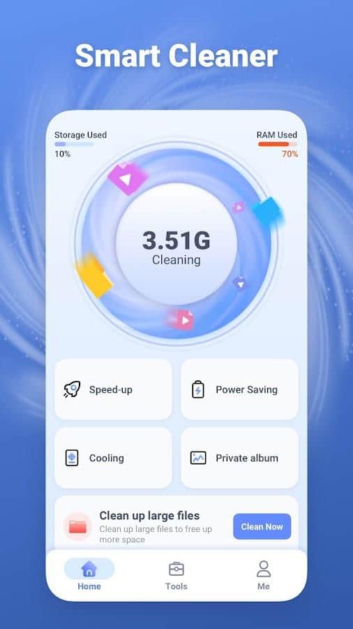 Al liberar regularmente la memoria del teléfono congestionada de cualquier basura, aseguras no solo un funcionamiento y rendimiento rápidos, sino también una alta seguridad de los datos. Esta aplicación contiene todas las funciones más necesarias que puedes usar para tus propios propósitos: crear un álbum personal y ocultarlo, detectar fotos similares y eliminarlas por completo, limpiar la caché de la aplicación y destruir archivos demasiado grandes acumulados en un teléfono inteligente en algún lugar dentro.