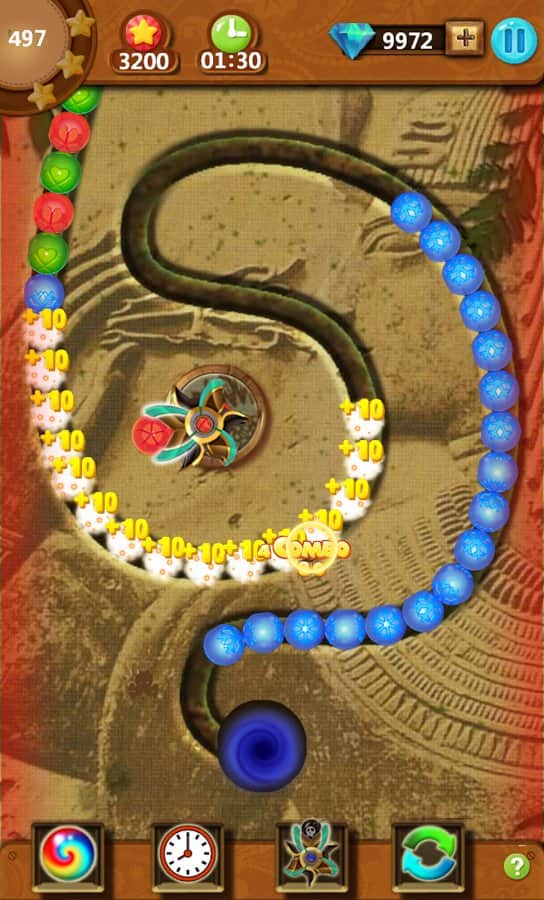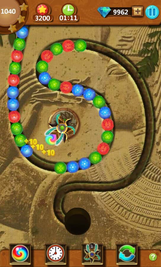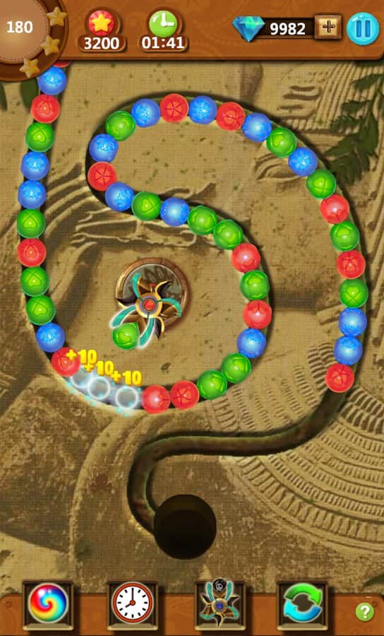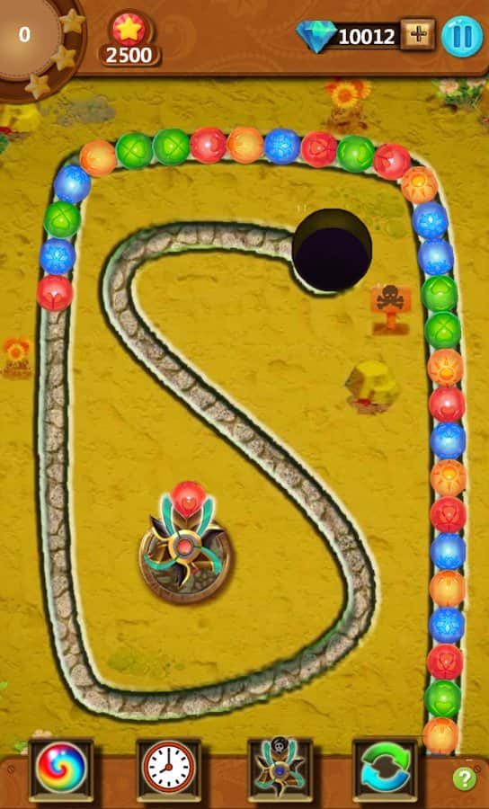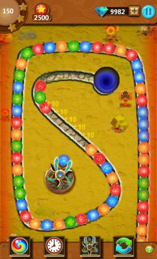 Mazu Ball – un emocionante juego para Android inspirado en Zuma, donde te encontrarás en el antiguo Egipto. En este juego tendrás que disparar bolas de colores desde un cañón y tratar de igualar tres o más bolas. Entrena tus poderes de observación y dispara las bolas en el grupo de globos del mismo color y hazlas explotar, viajando a través de varios niveles del juego. El objetivo es simple: necesitas hacer explotar todas las bolas en el nivel antes de que lleguen al agujero negro. Usa diferentes potenciadores y bonificaciones y así ralentiza o muévete en la dirección opuesta de la cadena. Establece tu récord de velocidad y asciende a la cima de la tabla de líderes.