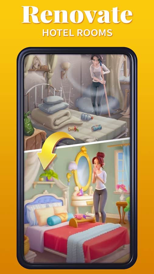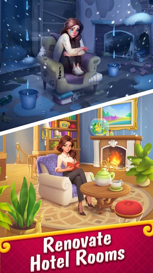 Merge Hotel Empire: Diseño - ayuda a Elsa a decorar su mansión, heredada de un pariente desconocido. Combina tres objetos en una fila y enfrenta numerosos niveles interesantes y desafiantes que te darán mucha energía y moneda local - estrellas - para renovar tu hogar. Además, completa varias tareas para ganar la moneda necesaria para comprar objetos más geniales. Desbloquea nuevas habitaciones para colocar diferentes cosas y luego restaurarlas a su apariencia normal. Nuestra dama también olvidó su hermosa ropa, así que la vestiremos en niveles especiales.