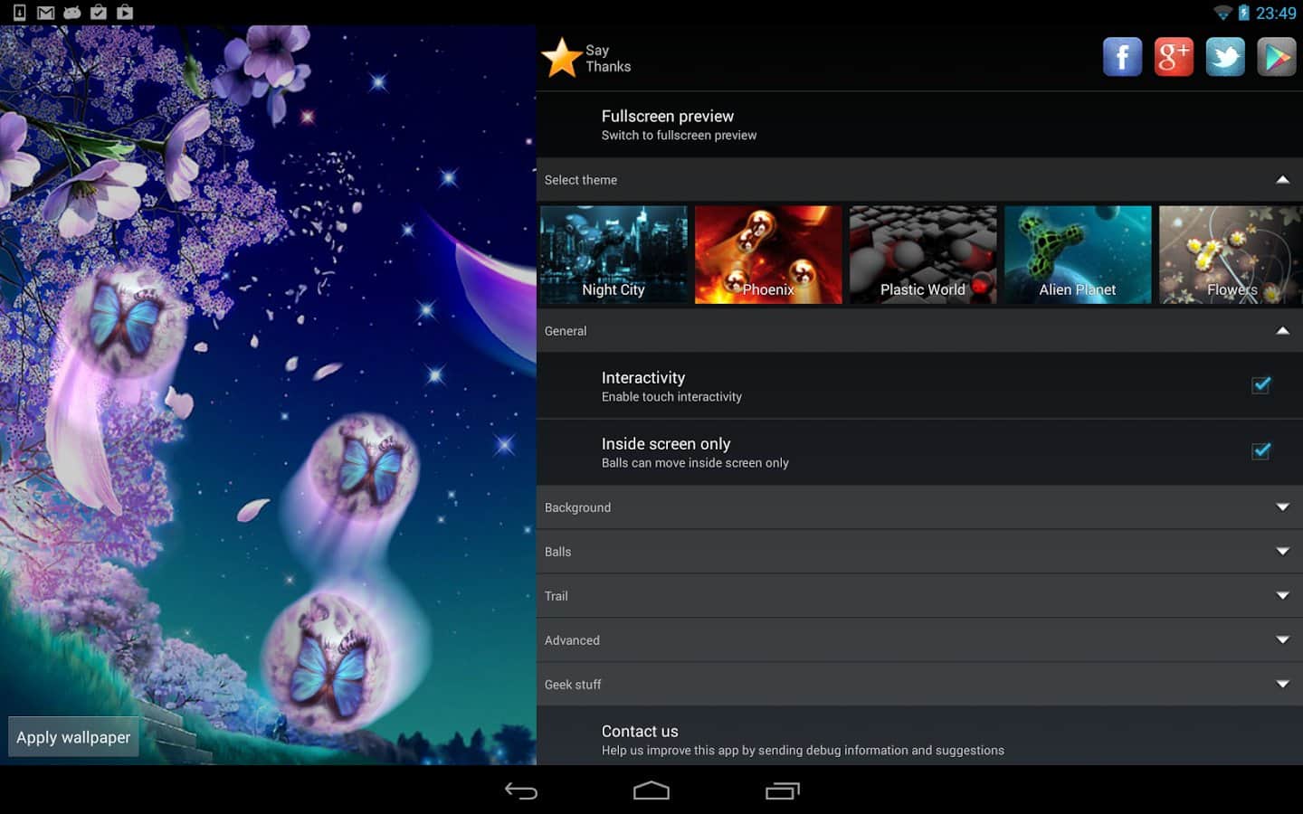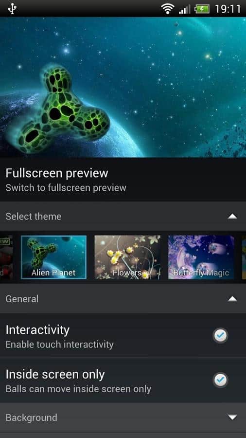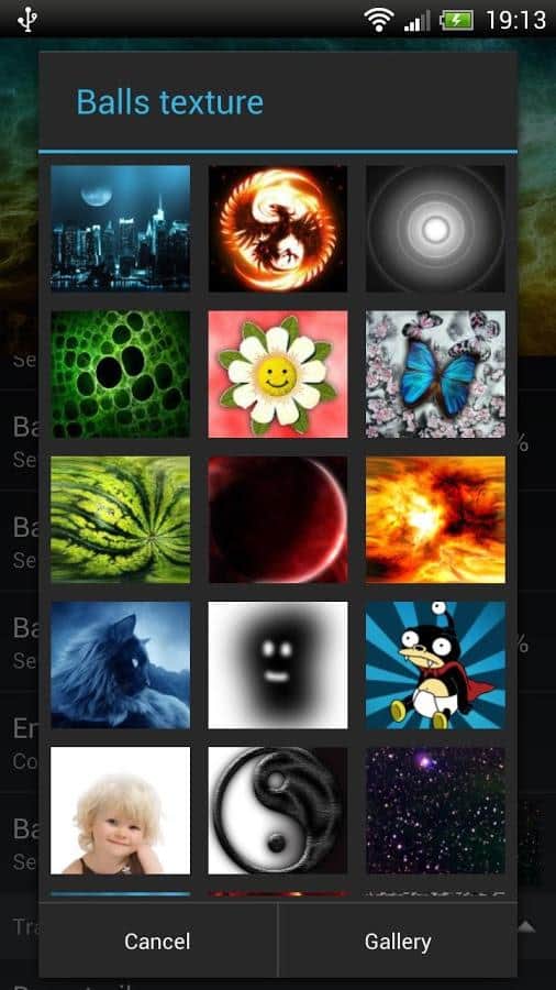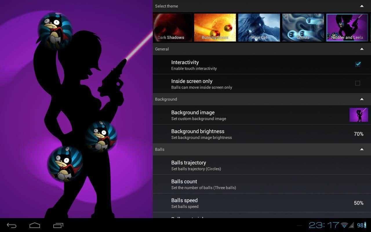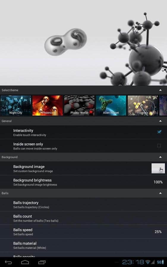 - Tu propio tema: elige cualquier imagen de la galería, establece el número de bolas, velocidad, color de trayectoria, establece efectos 3D y disfruta de los resultados! ¡Las bolas pueden hacer esto!