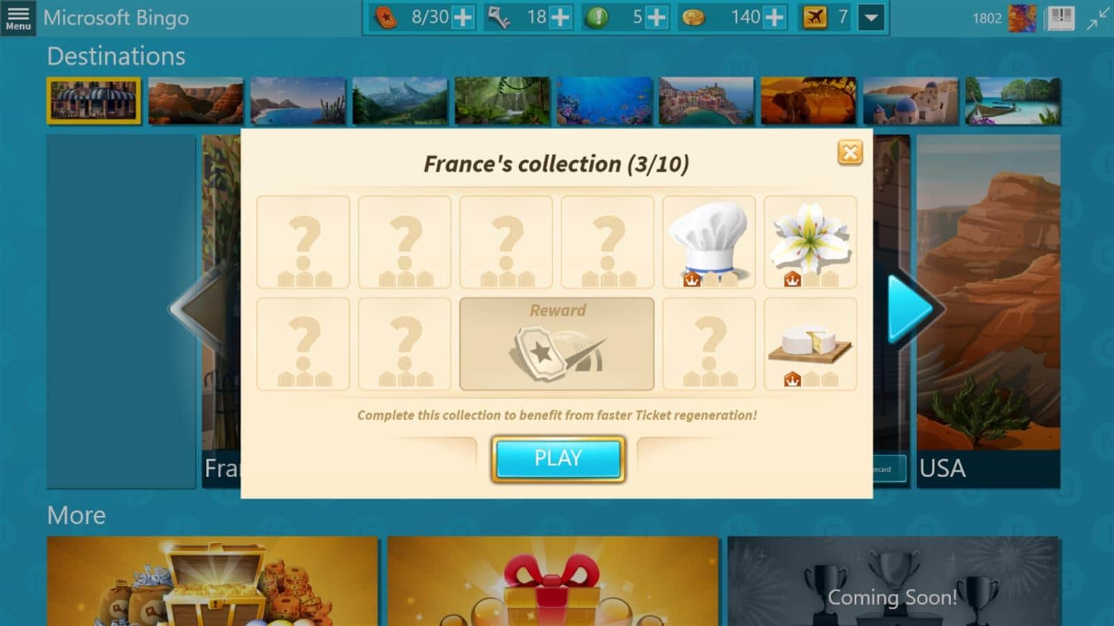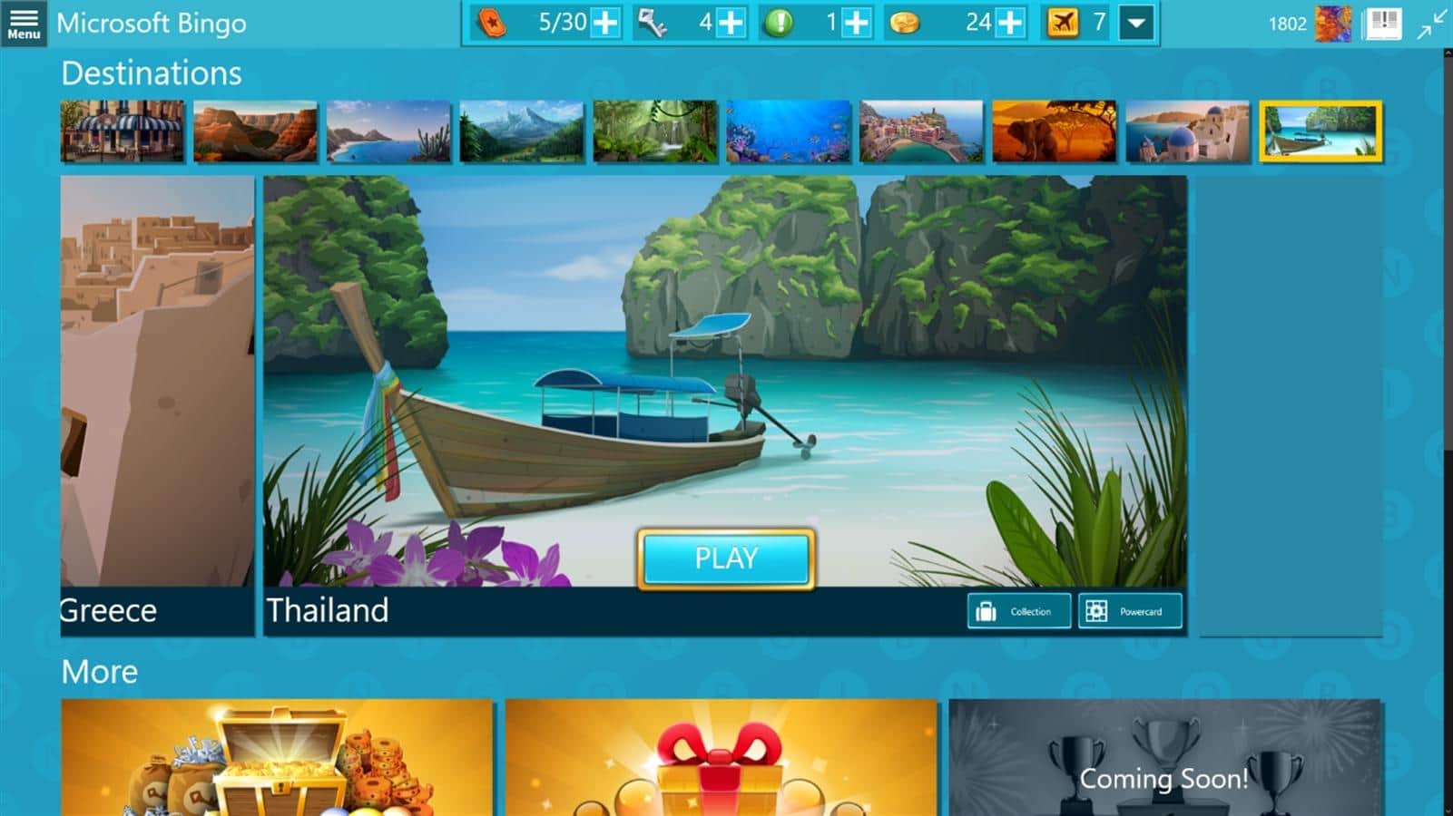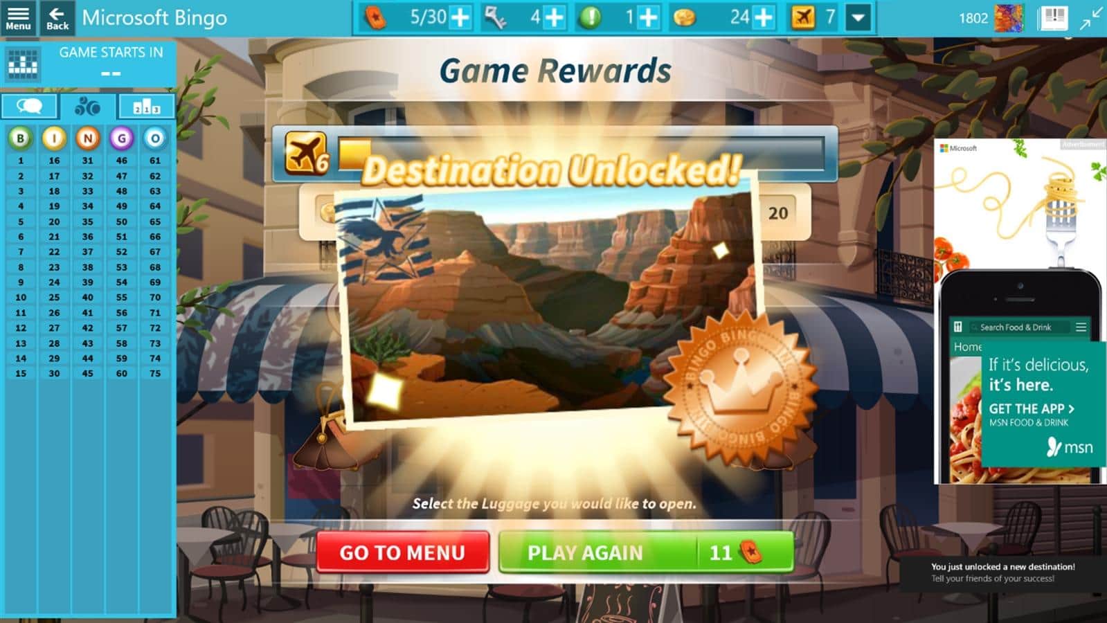 Microsoft Bingo es un juego clásico de bingo para Windows Phone donde viajarás por el mundo. Comienza tu juego en un acogedor café parisino y muévete por el mundo, llenando tus tarjetas y ganando premios. Este juego atraerá tu atención, porque en él podrás disfrutar de las increíbles vistas de los diferentes países y conseguir souvenirs y premios. Construye tu colección de souvenirs y repónla cada vez que vayas a un nuevo país. Completa misiones diarias y gana recompensas. Compra bonificaciones, algo de equipaje y viaja libremente.