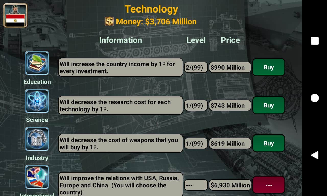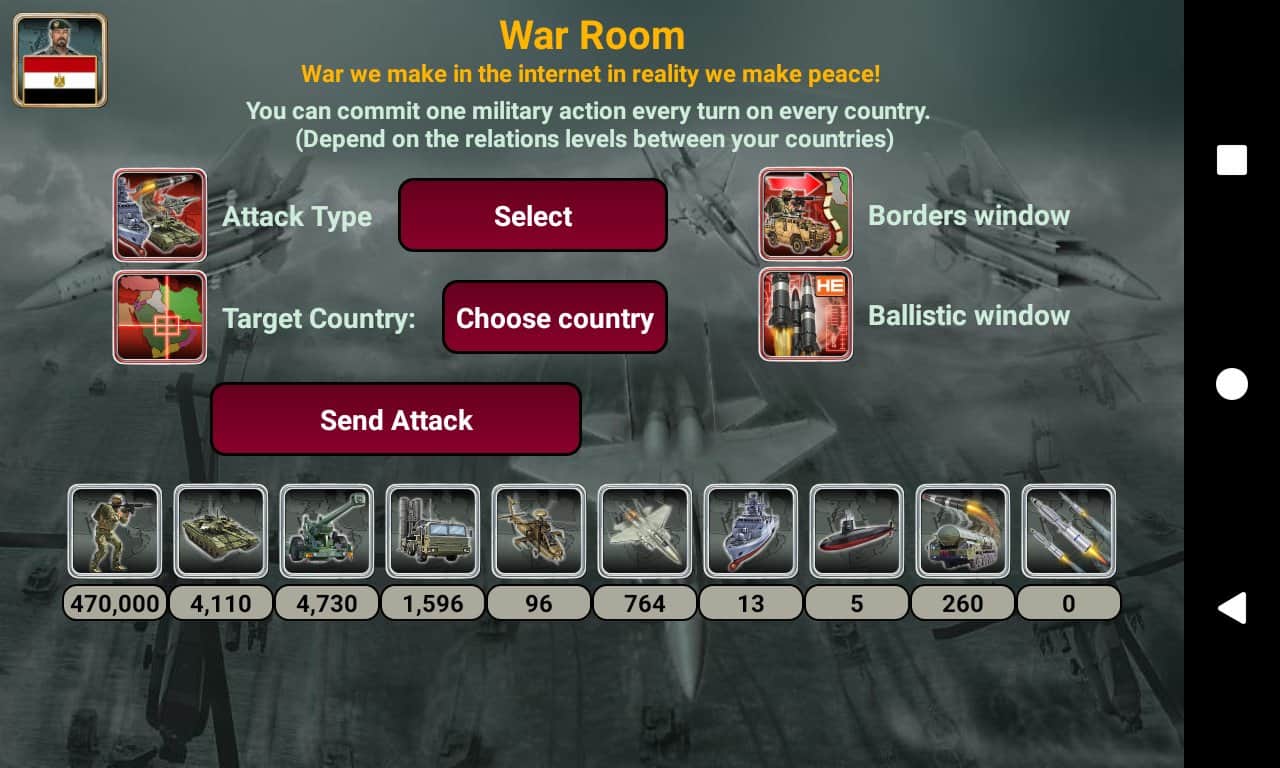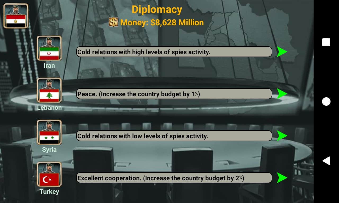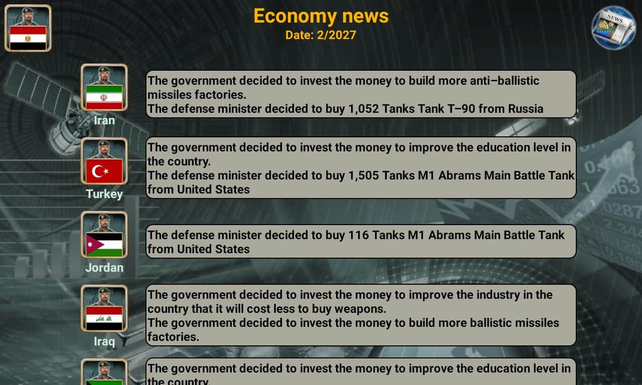 Imperio del Medio Oriente 2027 – estrategia para Android que te lleva en un futuro cercano en 2027. En este juego actuarás como el líder de los rebeldes, que ha ganado poder y ha anunciado su candidatura al Parlamento. Tu objetivo principal en este juego es tomar todo el poder en el Medio Oriente y crear un imperio económicamente avanzado. Desarrolla relaciones militares con otros países, compra armas y construye centros de espionaje, desarrolla tecnologías y sigue las noticias del mundo. Haz todo lo que puedas para tener éxito en este juego y demuestra tus habilidades de liderazgo.
