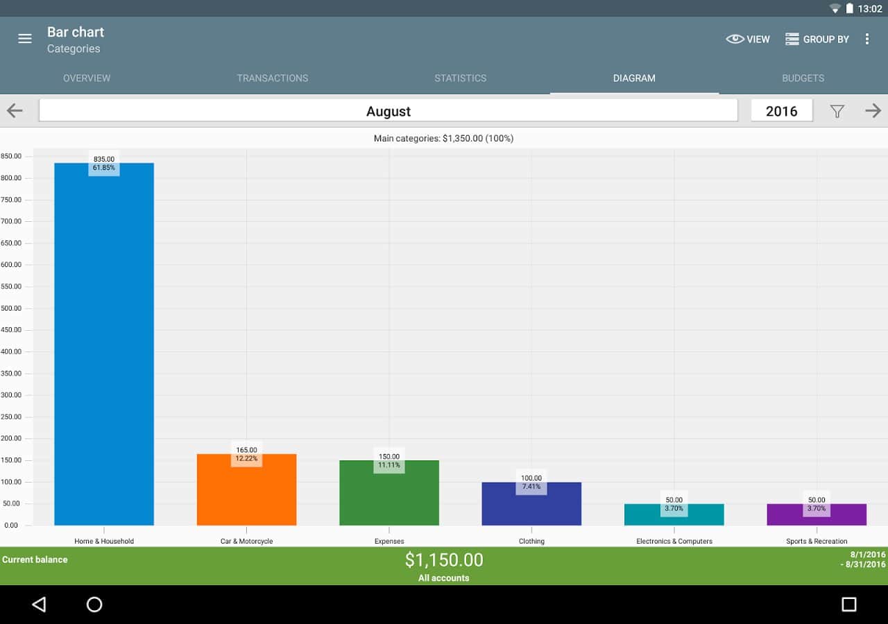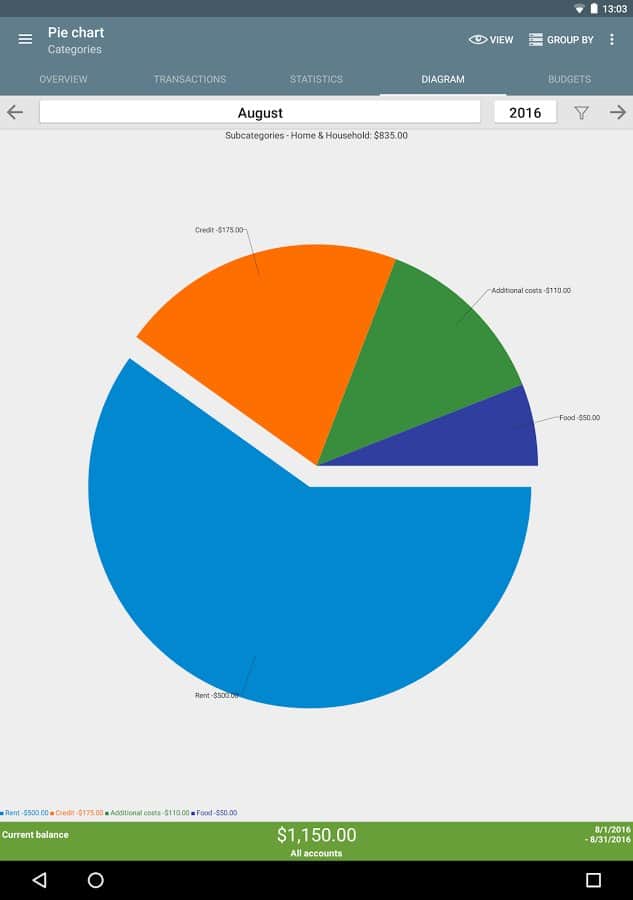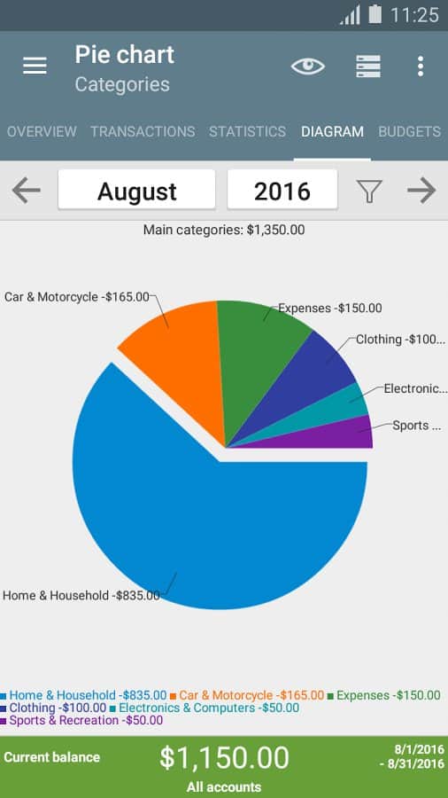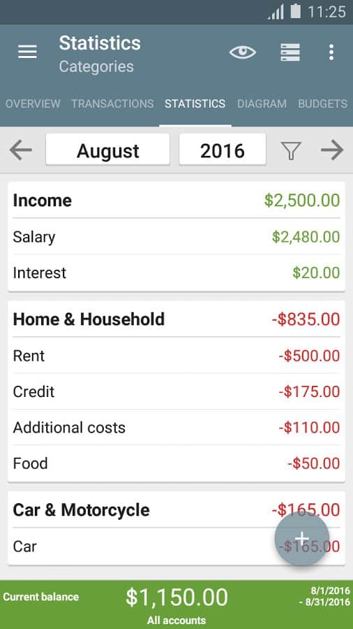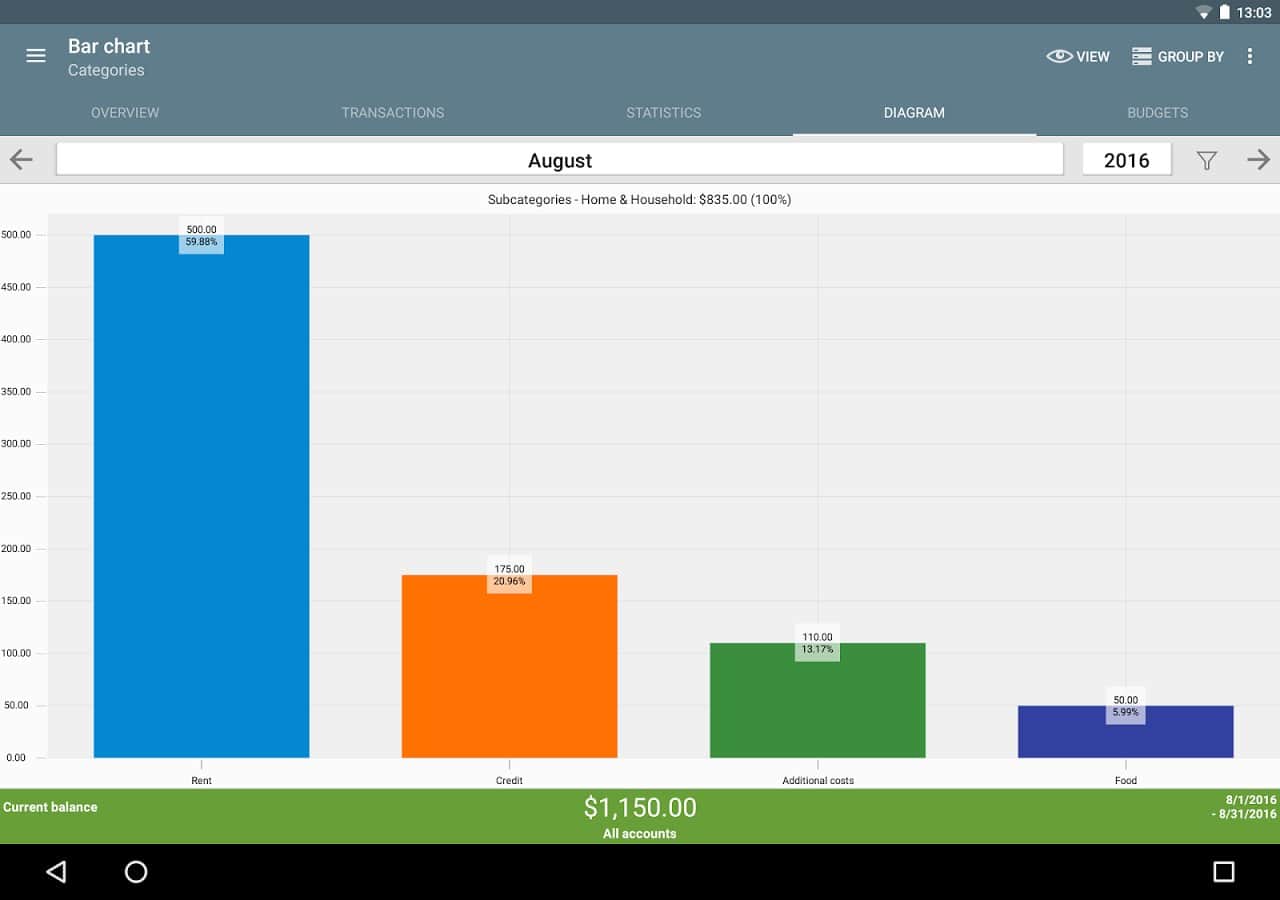ver el tema "Estadísticas" utilizando una tabla o gráfico y ver dónde gastas tu dinero, asignando tus ingresos y gastos por categoría.