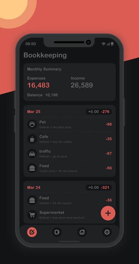 Money Manager (Elephant Bookkeeping) es una billetera multifuncional personal en tu smartphone. La aplicación permite llevar a cabo y monitorear todos tus ingresos y gastos, mostrando estadísticas detalladas. Money Manager dispone de una variedad de categorías: viajes, comida, medicina, ropa, impuestos, comunicación, malos hábitos, mascotas, educación, salario, inversiones y más. Esto te permitirá saber exactamente dónde está tu dinero. Con base en los datos ingresados, las estadísticas muestran el gasto dependiendo de la categoría. También es posible rastrear la dinámica entre los meses. Para mayor comodidad, el programa tiene varios temas que puedes cambiar en la configuración. Elige tu propio estilo único.