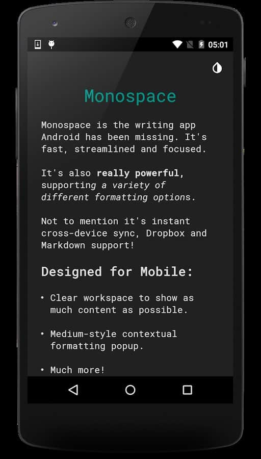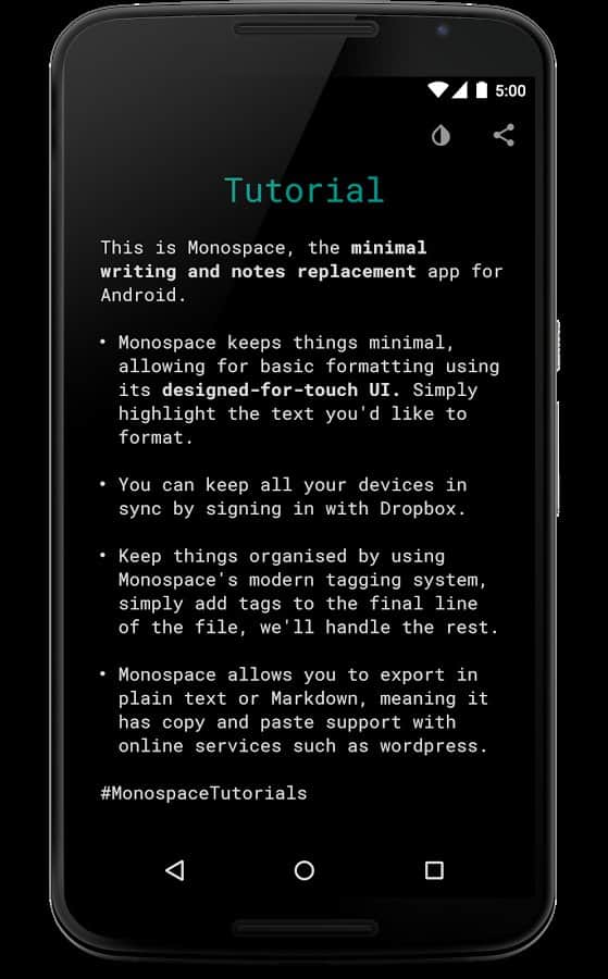 Es fácil y agradable escribir notas, o incluso bocetos cortos en un teléfono inteligente o tableta, pero a veces la aplicación acompañante está tan sobrecargada con elementos adicionales que trabajar con ellos se vuelve difícil. El editor Monospace Writer es de otro tipo, no hay nada superfluo, solo lo más básico.