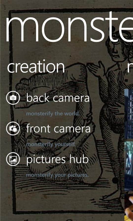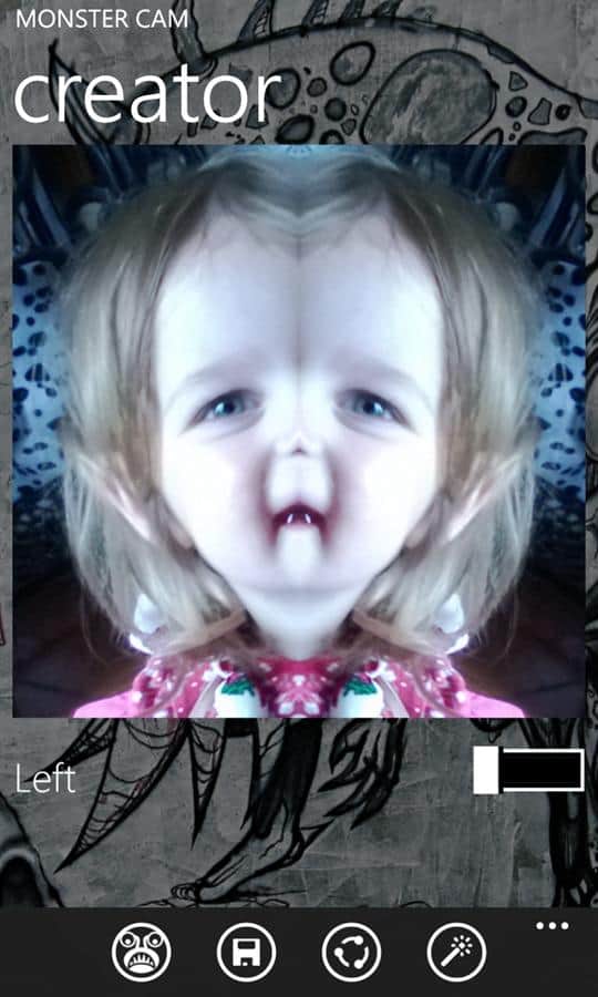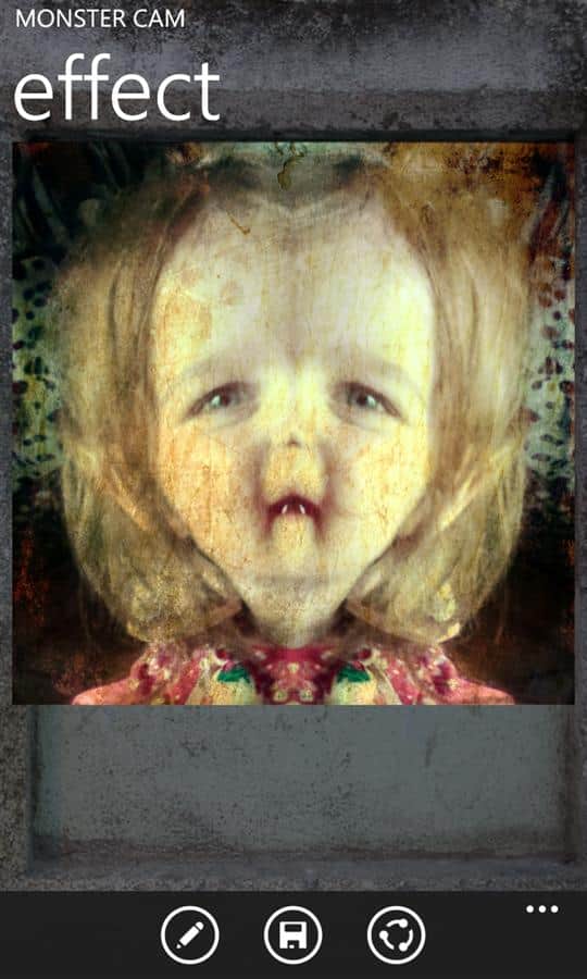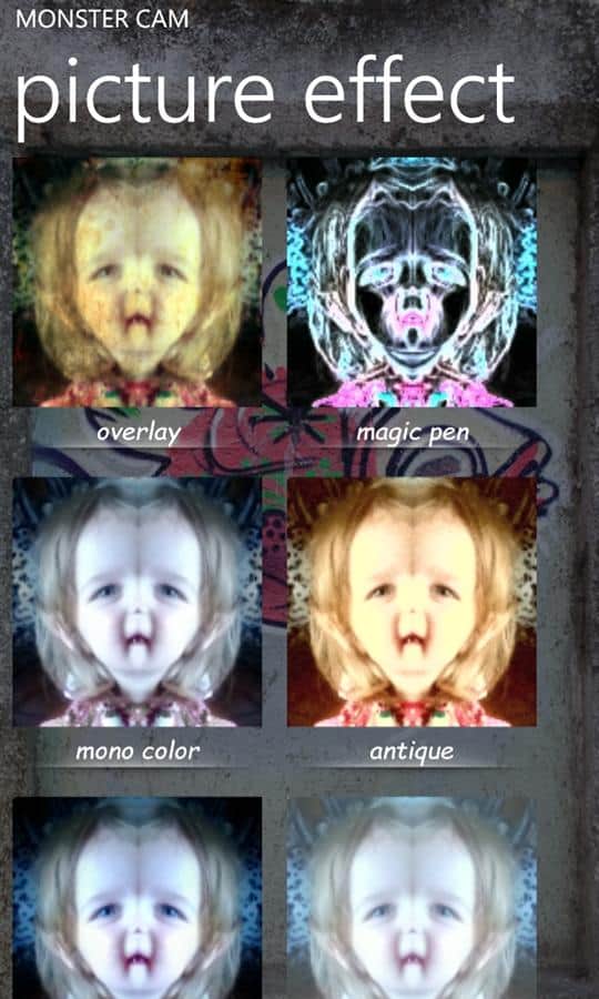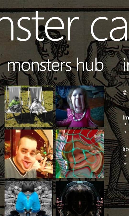 MonsterCam - software para teléfonos Windows, que te ayudará a convertir todas tus fotos aburridas en un espectáculo de monstruos. Transforma a tus amigos, perros, maestros aburridos o vecinos en estos freaks. Con esta aplicación puedes divertirte bastante y compartir tus monstruos en las redes sociales.
