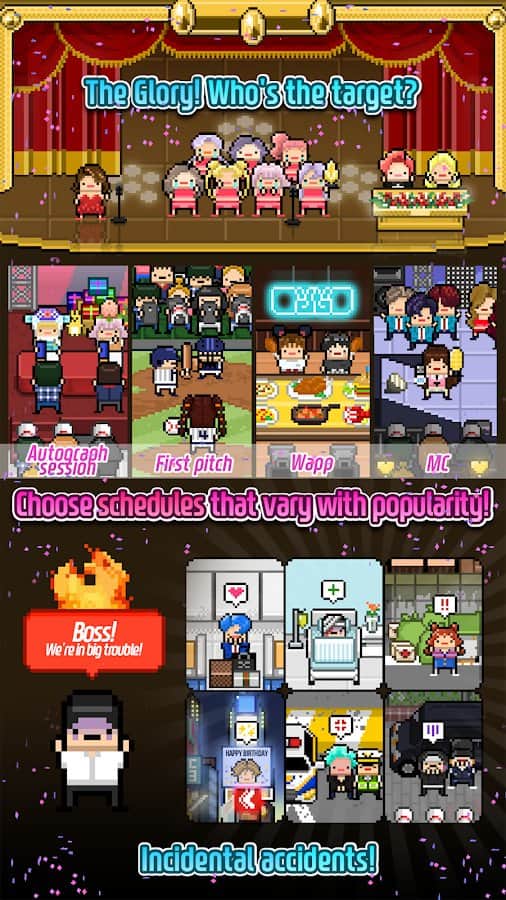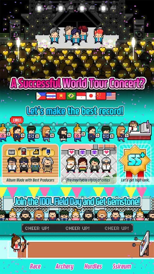 Idol Mensual – un interesante simulador en Android donde jugarás el papel de productor. En este juego te convertirás en el dueño de una pequeña agencia en la producción y desarrollo de grupos musicales. Reúne a tus chicos o a un grupo de chicas y haz que sean conocidos en todo el mundo. Firma un contrato con ellos para grabar numerosas canciones. Piensa en conciertos en tu ciudad y sal de gira a varias ciudades, recibiendo críticas entusiastas de sus fans. Haz que tu grupo sea popular y crea un cronograma para grabar canciones y conciertos. Los álbumes venden millones de copias y reproduce toda tu música en YouTube.