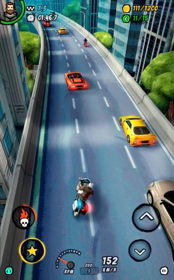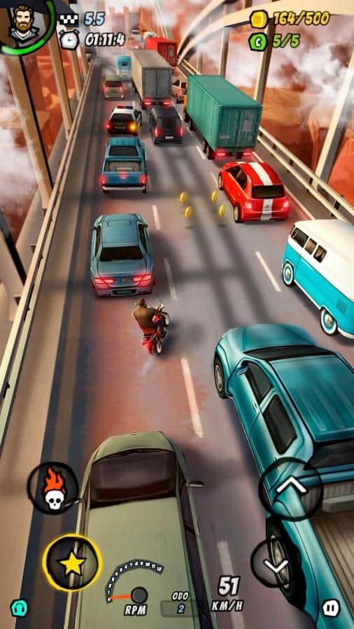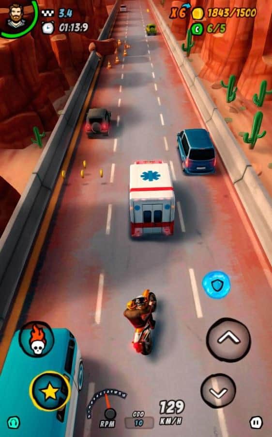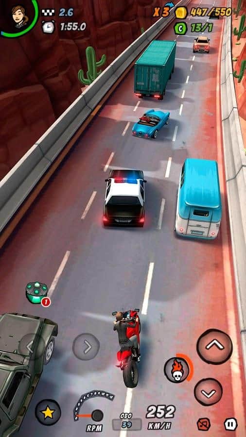 Moto Racing 2 – conduce una motocicleta y recorre diferentes pistas del juego. En este juego con vista superior controlarás la motocicleta y la moverás de un lado a otro, evitando colisiones con numerosos vehículos en una autopista concurrida. En este juego conducirás por la autopista en el desierto, en el bosque invernal y en la ciudad. Conduce tu moto hacia adelante y supera todos los obstáculos en su camino mientras te preparas para las cambiantes condiciones climáticas y la hora del día. A lo largo del camino, recoge varios bonificaciones en forma de escudos de energía y potenciadores. Obtén valiosos premios y desbloquea nuevas motos con características únicas.