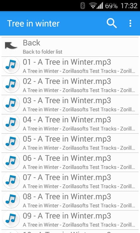 - Muestra una lista de archivos de audio por separado para cada carpeta