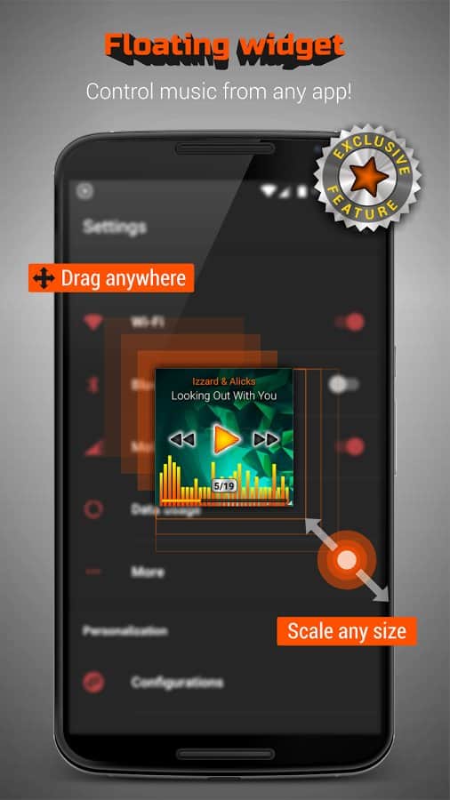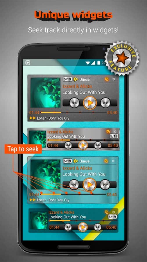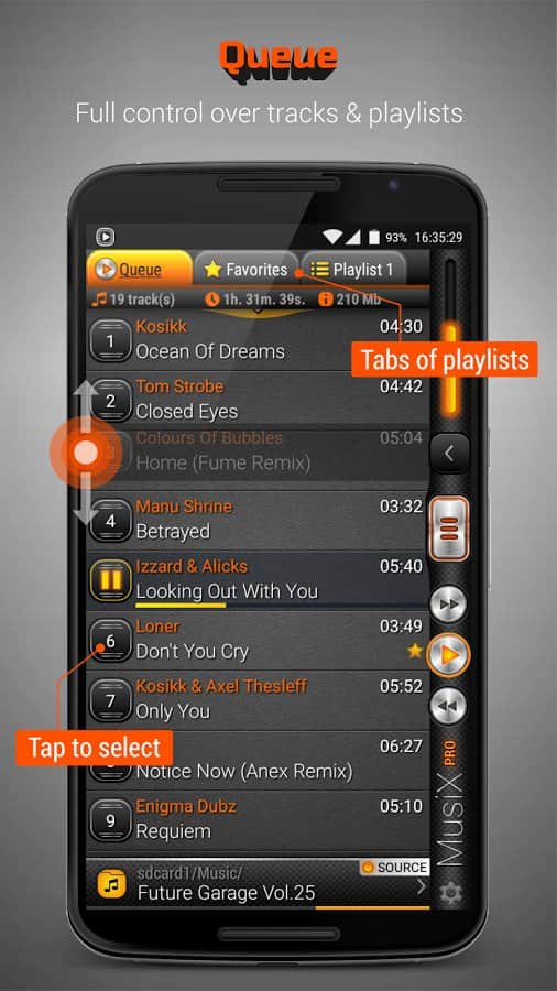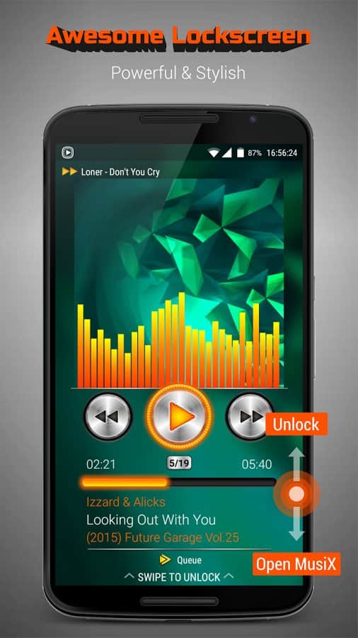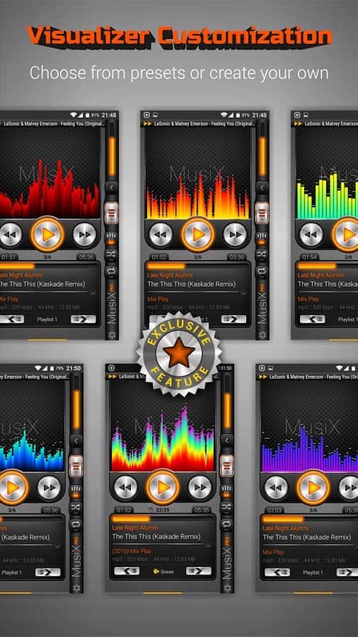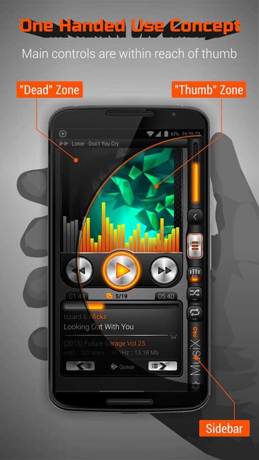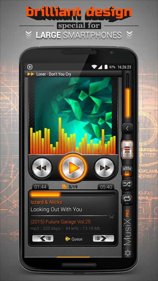 MusiX Player - un reproductor funcional con un diseño brillante y expresivo, que es ideal para smartphones con pantallas grandes (4,5-6 pulgadas). Un diseño especialmente creado para dispositivos grandes le brindará una experiencia inolvidable al usar el reproductor. Soporte para una gran cantidad de formatos de audio y ajustes finos del ecualizador: este es el conjunto mínimo de funciones necesarias para cualquier reproductor. Características::