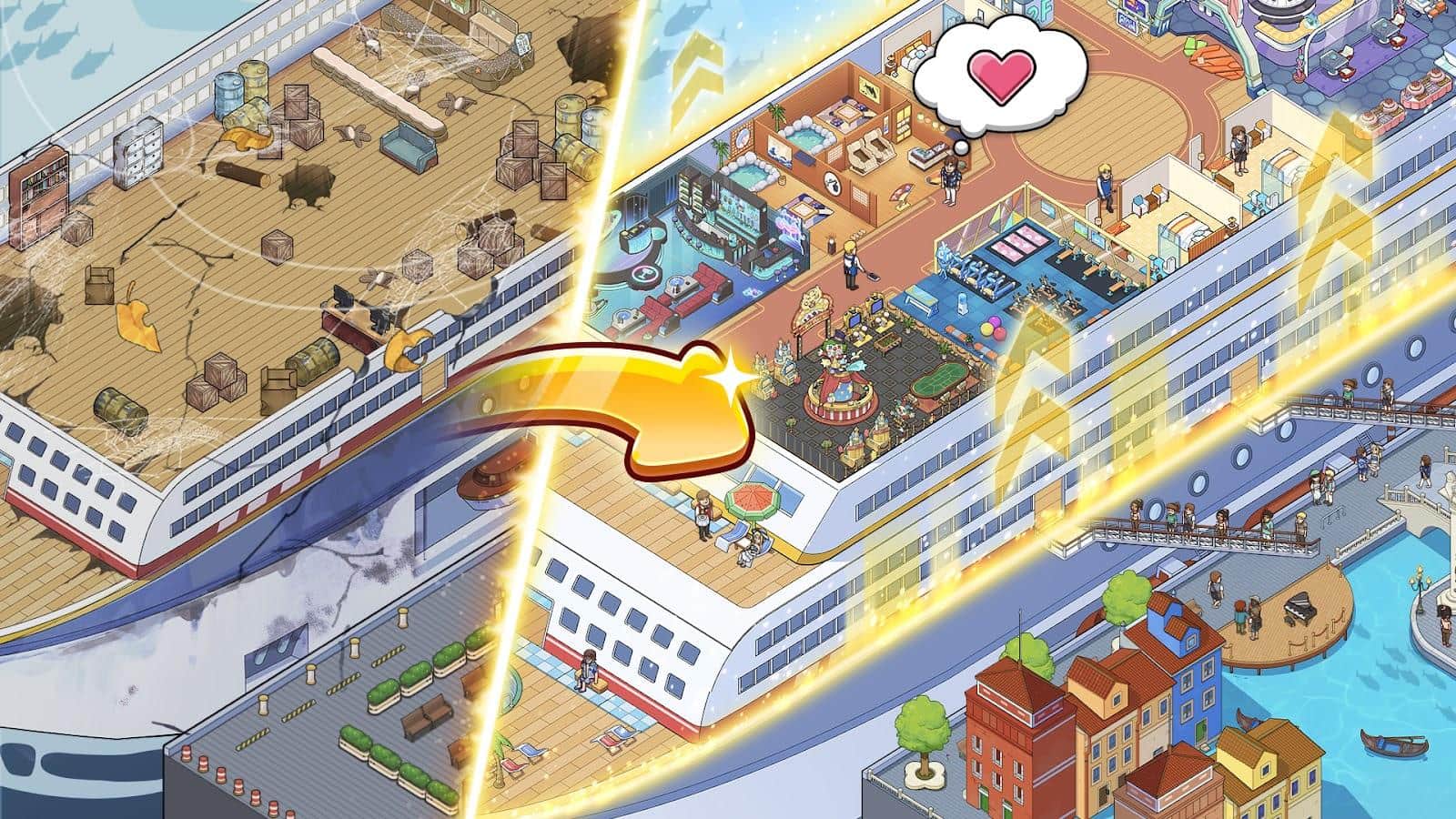 ¡Te presentamos una aventura inolvidable en un crucero que navegará alrededor del mundo! Nuestro barco no solo ofrece cabinas, sino verdaderas casas acogedoras con comodidades. Desde barcos aburridos hasta lujosos cruceros de ensueño, elige lo que más te convenga. Conoce a huéspedes de todo el mundo, cada uno tiene su propia historia y preferencias únicas. Mejora y moderniza tu barco de crucero, ofreciendo el más alto nivel de servicio, abriendo unas vacaciones de ensueño para los huéspedes y mejorando tu reputación.