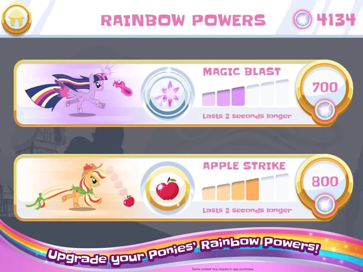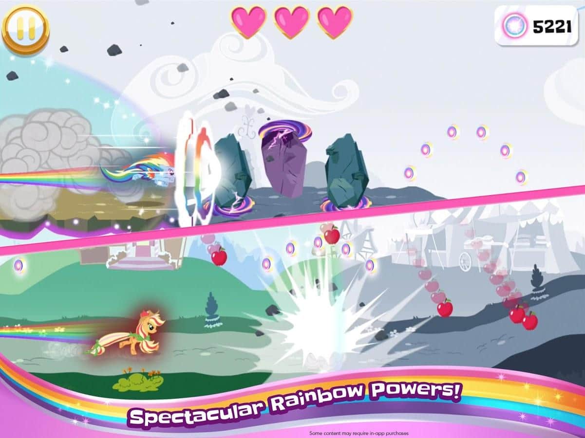 My Little Pony Carrera Arcoíris es un juego de arcade casual con elementos de corredor en el que tienes que ayudar a una pequeña, pero muy fuerte y decidida pony a salvar el mundo de la desgracia. ¿Te preguntas qué pasó? Ponyville fue sometida a una maldición, empezaron a aparecer portales que absorben todos los colores y hacen que el mundo sea en blanco y negro. Corre, salta, esquiva obstáculos, utiliza las habilidades únicas de cada uno de sus adorables ponis. Cierra los portales uno por uno, realizando diferentes tareas y misiones. Usa la transformación arcoíris y mejora todas sus características para un paso rápido y fácil.