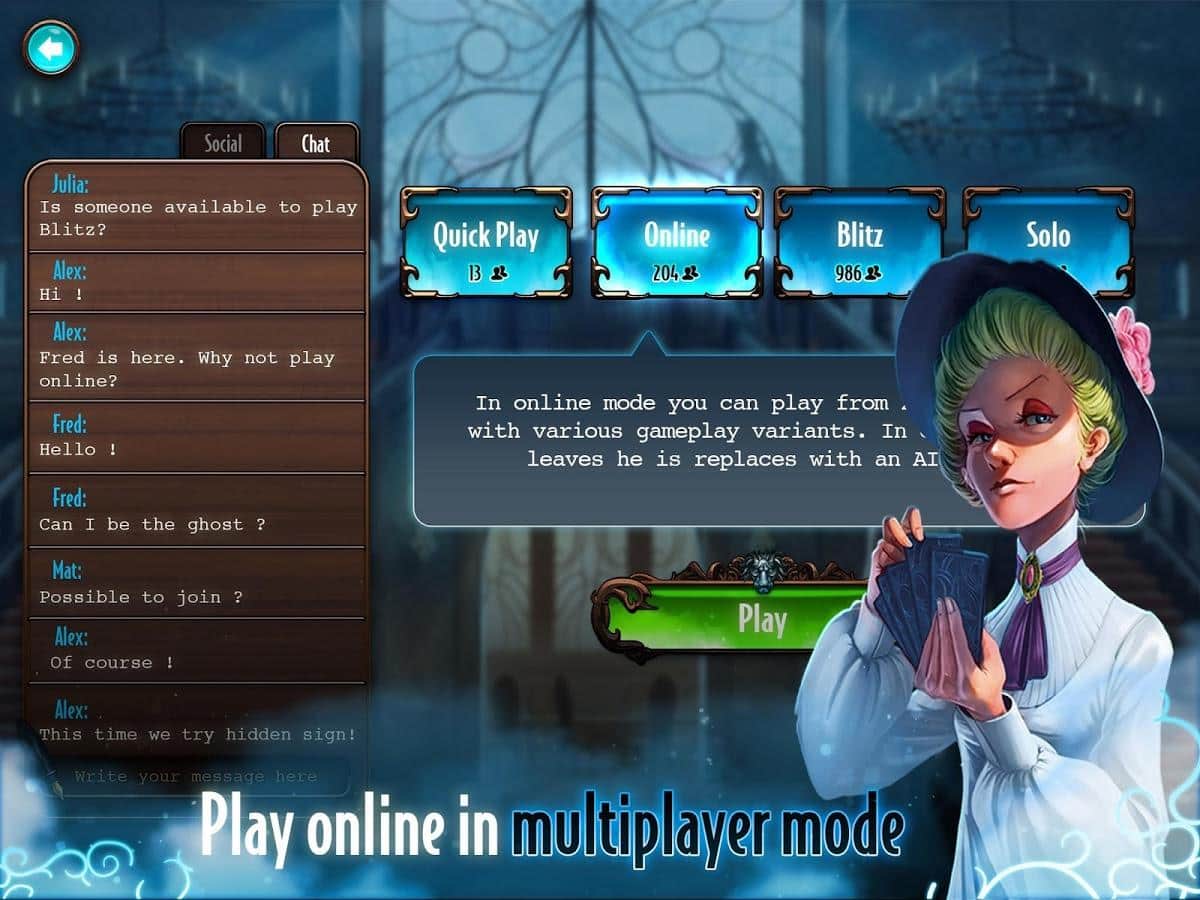 Mysterium: El juego de mesa – un juego de mesa para Android, creado a partir de la trama de los juegos oficiales de Mysterium. El juego comienza con un Fantasma que reúne a un grupo de psíquicos y los envía a investigar un asesinato. Elige tu rol en este juego donde puedes jugar como el Fantasma lanzando pistas o ser uno de los psíquicos, lo cual no es una tarea fácil para investigar la escena del crimen y encontrar el arma del asesinato. Con la ayuda de cartas especiales de Visión, descubre el misterio del asesinato y ayuda al Fantasma a encontrar la paz. Este juego tiene varios modos de juego, un jugador y en línea, donde puedes jugar con tus amigos, hasta 7 personas a la vez. Disfruta de la gran narrativa y los gráficos sobresalientes.
