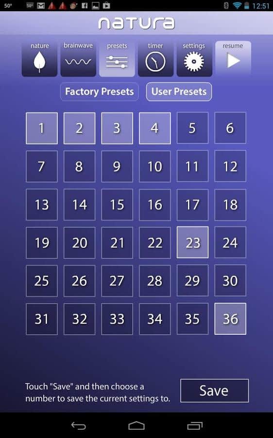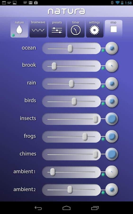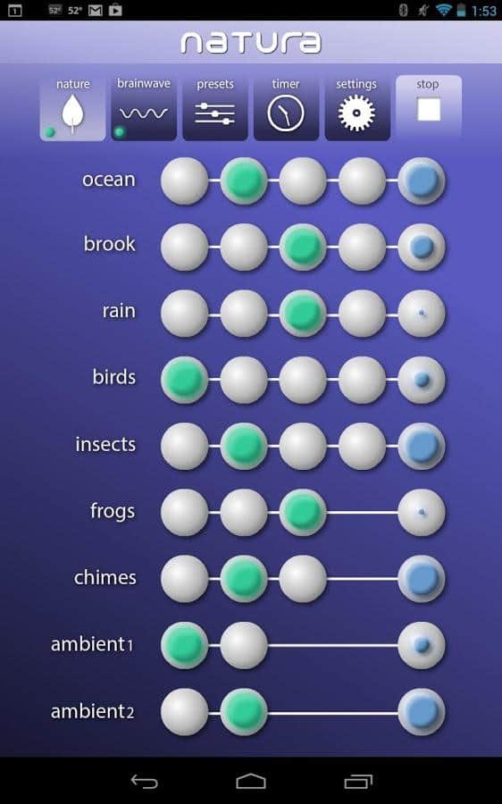 Aplicación Natura Sound Therapy para Android, que te permitirá crear un sonido de fondo agradable. La aplicación se utiliza activamente en terapia de sonido (parcialmente en yoga y spas). Con la ayuda de este programa podrás relajarte y alejarte de los pensamientos perturbadores. Los sonidos de la naturaleza, el sonido de la lluvia, el viento, el canto de los pájaros y otros sonidos agradables ayudarán a restaurar y equilibrar. Además, podrás crear tus propias composiciones. La interfaz es simple y conveniente. La aplicación contiene: