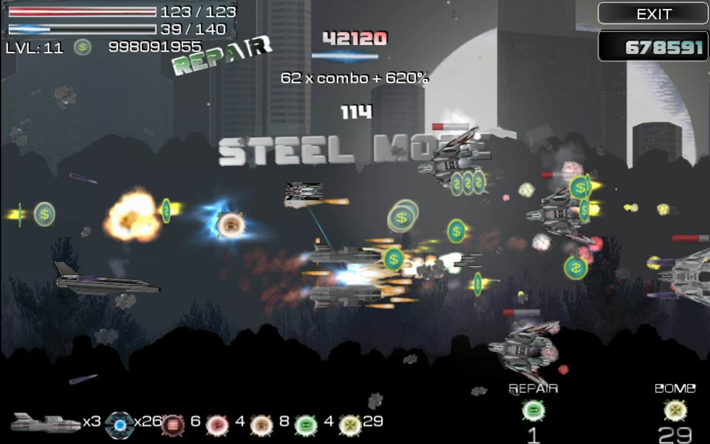 Sky Steel - Ultimate Edition - es un juego de acción de desplazamiento lateral con elementos de RPG, donde deberás proteger la galaxia de enemigos. Lucha contra poderosos jefes y varios enemigos utilizando peones láser y bombas. Te esperan diferentes mundos y varias etapas del juego, donde tendrás la oportunidad de desbloquear un nuevo avión o mejorar el tuyo con varias actualizaciones.