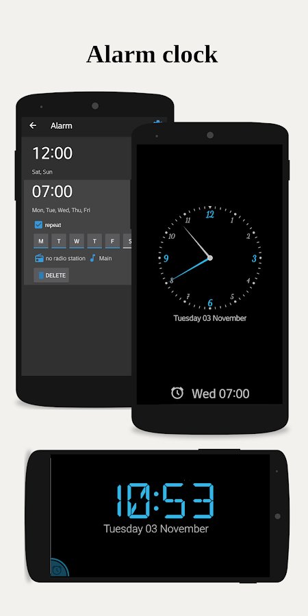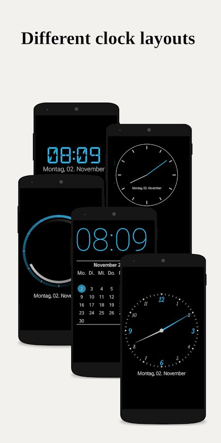 Reloj nocturno - un reloj de mesa que ajusta automáticamente el brillo de la pantalla según la hora del día. Durante el día, la pantalla se mantiene brillante, mientras que por la noche se atenúa para no interferir con su sueño. Su manejo sencillo permite cambiar fácilmente el tamaño de la fuente con un gesto de pellizco con dos dedos.