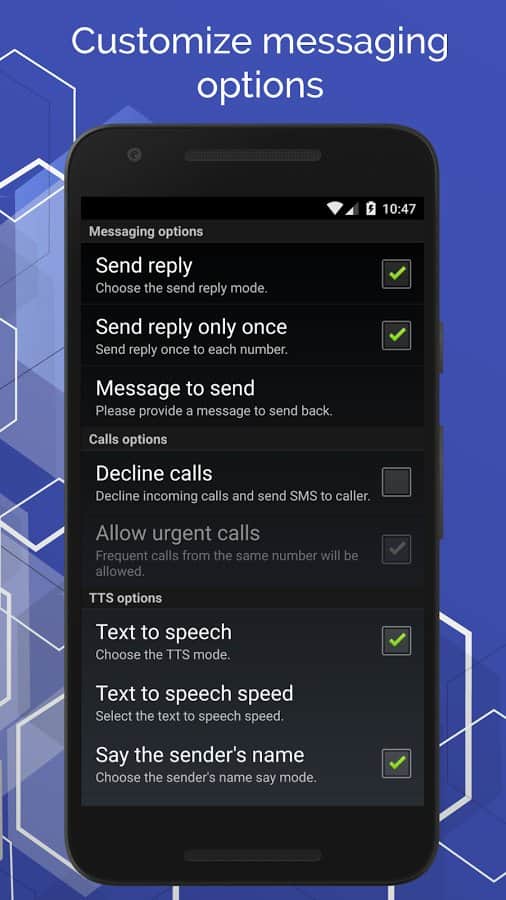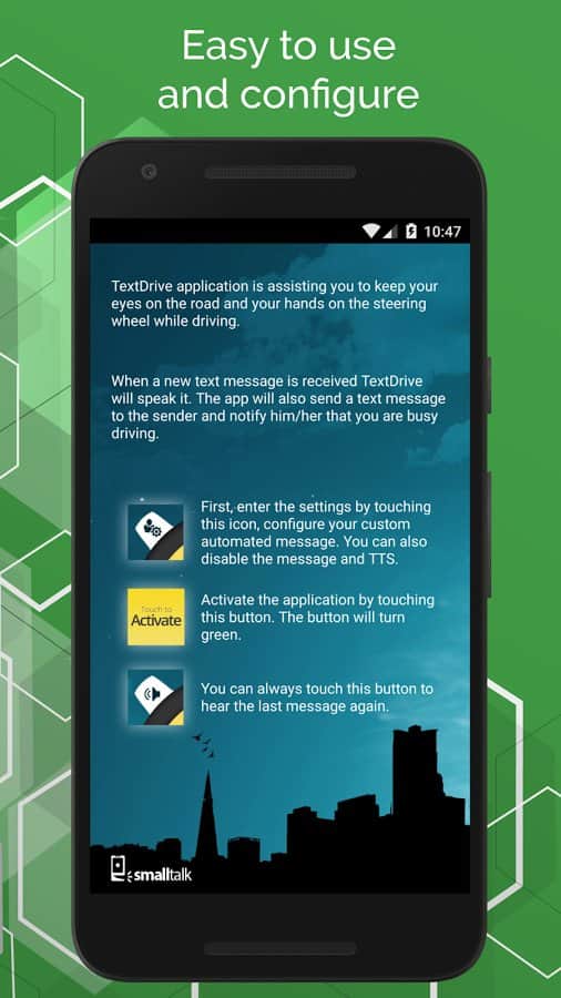 No enviar mensajes de texto mientras conduces Pro - Conducir es una cosa muy peligrosa, y en el mundo de hoy los conductores a menudo se distraen con sus dispositivos móviles, lo que provoca una situación peligrosa. Esta aplicación tiene como objetivo resolver este problema de una vez por todas. No solo les ayudará a aceptar llamadas, sino que incluso ayudará a leer los SMS y el correo. Todo lo que necesitas es configurar correctamente la aplicación y activarla mientras conduces, para que el mensaje que llegue a tu teléfono se lea automáticamente en voz alta.