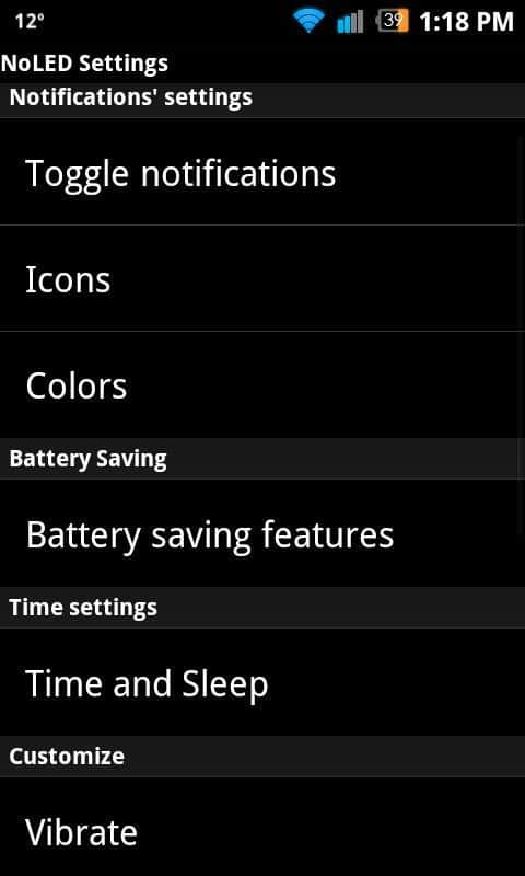 NoLED - aplicación de Android para smartphones Samsung Galaxy S, y posiblemente otros smartphones con AMOLED pantallas en las que no hay indicadores de luz para informar sobre llamadas perdidas, SMS y otras notificaciones. A través de este programa, puedes personalizar la pantalla como desees para las notificaciones perdidas, en forma de iconos de colores que se mueven en una pantalla negra. La batería consume mucha energía debido al hecho de que el programa se basa en las propiedades de las pantallas AMOLED: desperdiciando energía solo para los píxeles iluminados.