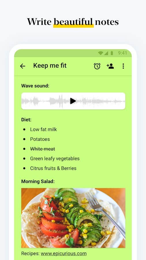 Comienza con notas de texto, añade imágenes, listas de verificación e incluso grabaciones de audio, todo dentro de una entrada.