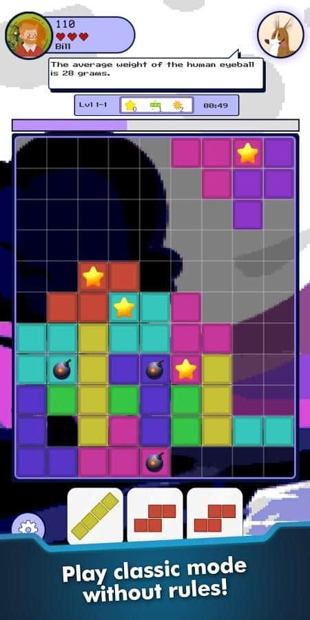 NotTetris - Juego de Rompecabezas de Bloques es un juego de rompecabezas único que se adaptará absolutamente a todos: adultos y niños, principiantes y jugadores avanzados de este género. Elige uno de los modos de dificultad disponibles: clásico, ráfaga, en tiempo real o aventura y comienza. Necesitarás llenar las líneas verticales y horizontales vacías. Abre formas geométricas y muévelas a la unidad con solo un toque, pasa los niveles y recoge puntos y bonificaciones, y asciende en las clasificaciones y mejora tus habilidades intelectuales.