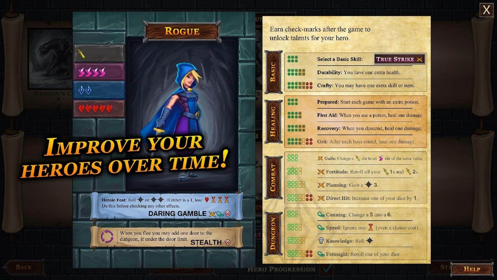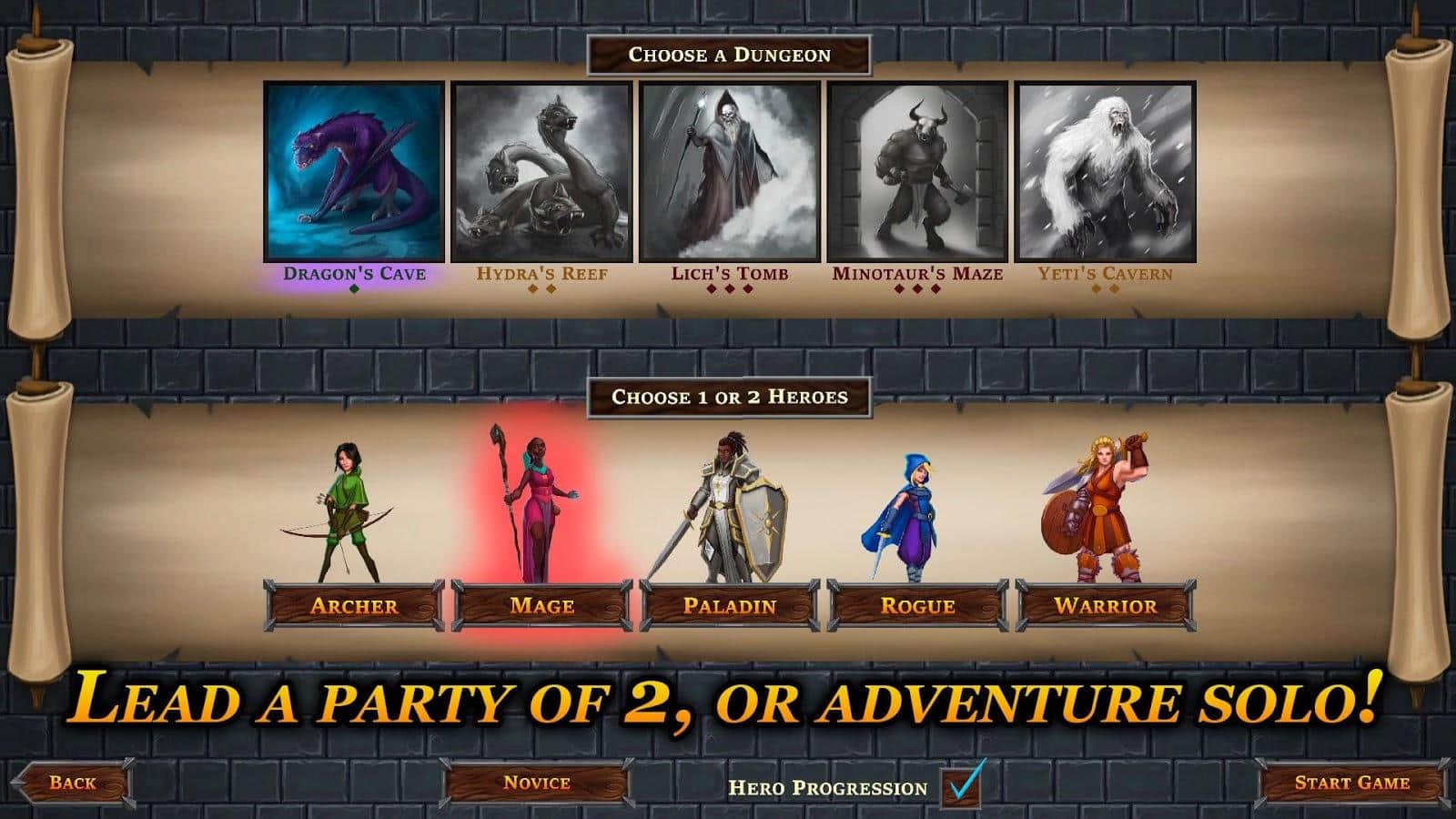 Una Baraja de Mazmorras – Juego de mesa en Android, donde explorarás mazmorras y lucharás contra enemigos. Elige un personaje de cinco héroes en el juego y comienza tu viaje. Puedes ser un mago, guerrero, pícaro, paladín o arquero. Todo este juego durará 15 minutos, durante los cuales necesitarás recoger tantas cartas con diferentes talentos y habilidades y ganar experiencia que te será útil en los siguientes juegos. Explora la cueva del dragón, glaciares, yetis, arrecifes, Hidra y la tumba del Liche y destruye al Minotauro. Crea tu personaje y logra resultados increíbles.