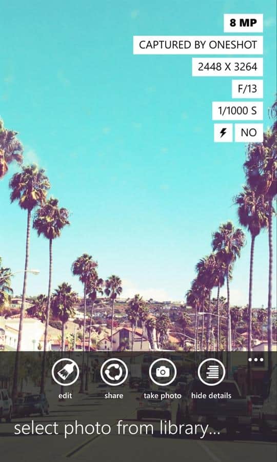 OneShot es una cámara profesional con efectos de alta calidad para Windows Phone. La aplicación tiene muchas características que puedes aplicar al tomar fotos, como efectos, contraste, brillo, saturación, balance de blancos, velocidad de obturación, enfoque manual y muchas otras. Esta aplicación es muy fácil de usar y sin duda atraerá a los aficionados a las fotos.