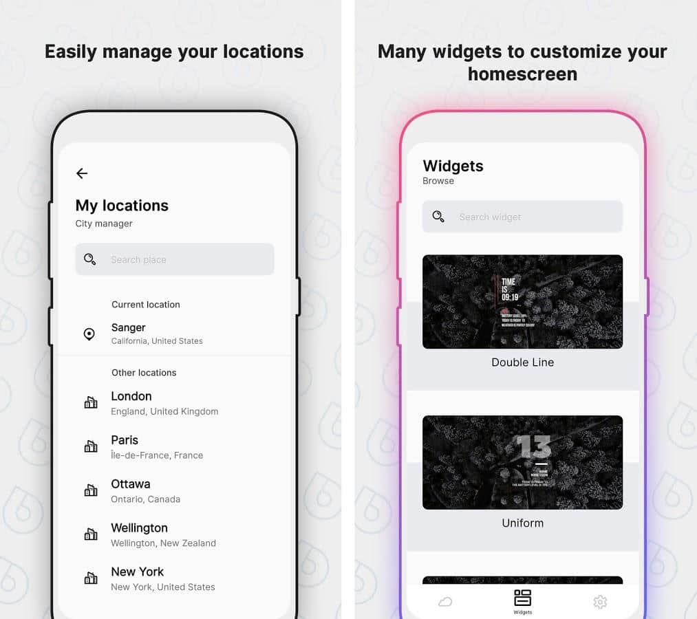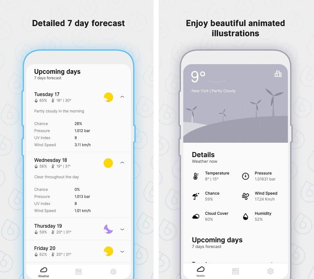 puedes encontrar pronósticos del tiempo precisos con la ayuda de widgets cómodos y coloridos - la tarea principal de la aplicación Overdrop - Tiempo Animado & Widget. Sabrás de antemano cómo estará el clima afuera, cómo vestirte mejor para mantenerte abrigado. Y no olvides llevar tu paraguas si está lloviendo.