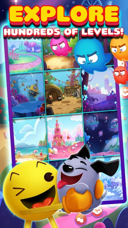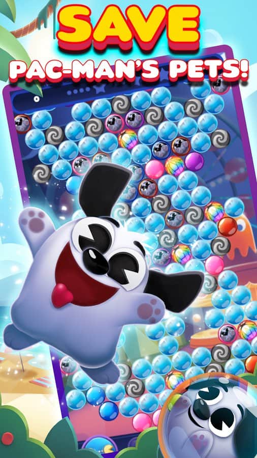 PAC-MAN Pop - Bubble Shooter – nuevo juego en Android donde ayudarás al héroe PAC-MAN a devolver toda la fruta en PAC-Tierra. Los arrogantes fantasmas Inky, Blinky, Pinky y Clyde han reemplazado todas las frutas y animales del mundo de hadas en la trampa y ahora solo nuestro héroe PAC-MAN puede salvarlos y traerlos de vuelta. Dispara burbujas coloridas a un grupo de ellas allá arriba y despeja el campo de juego de burbujas, mientras recolectas los animales que caen. Ayuda al valiente héroe PAC-MAN a recoger todas las mascotas y rescatarlas de sus fantasmas. Este divertido juego te deleitará durante muchos niveles de sus rompecabezas y acertijos mentales.