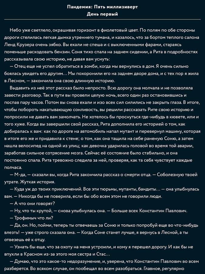 Han pasado tres meses y en todo el mundo hay una terrible pandemia arrasando. La humanidad ha cometido el terrible error durante su existencia, llamando a la nueva vacuna la recuperación de todas las enfermedades. ¡Resultó que este terrible virus del cual no hay salvación! ¡La vacuna no solo trata enfermedades, desde resfriados hasta las peores enfermedades! ¡También trata la muerte! Después de la muerte de su huésped, el virus progresa y convierte a las personas en muertos vivientes, que están completamente privados de todos los sentidos. Todo lo que queda de las personas no es un gran número de sobrevivientes que tuvieron la suerte de esconderse. ¡Tú eres uno de los pocos afortunados! Pero la pregunta es. ¿Qué harás?!