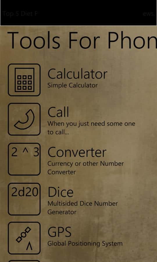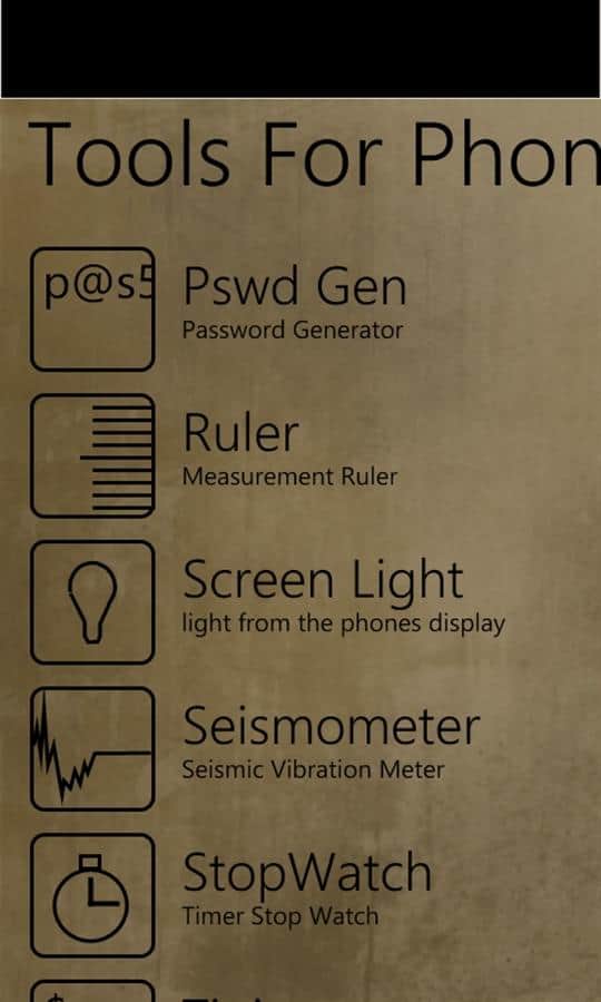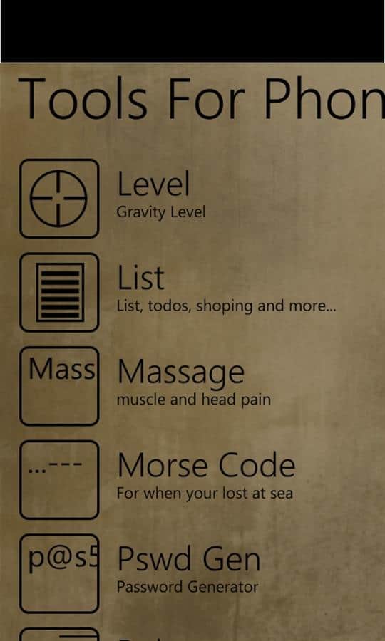 Parchment Tools – una aplicación única para Windows Phone que contiene un conjunto de herramientas de diversos tipos, a veces necesarias, tanto para hombres como para mujeres. Todo es simple: selecciona la herramienta adecuada y úsala para otros propósitos.