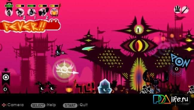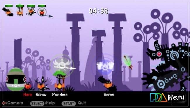 Patapon 2 - la increíble estrategia musical para PSP. Ya intrigante... pero la conclusión es - tú controlas tu ejército, pero no solo des órdenes - así que no escucharás a tus soldados. ¡Necesitas marcar correctamente el ritmo del tambor, y entonces tu ejército será invencible! ¡Es hora de presionar los botones correctos y simplemente tocar a tiempo! Todo es simple y a la vez interesante. ¡No olvides mejorar a los héroes y proporcionarles equipo! El juego tiene un modo muy agradable para hasta 4 jugadores, y siempre es divertido estar juntos con amigos!