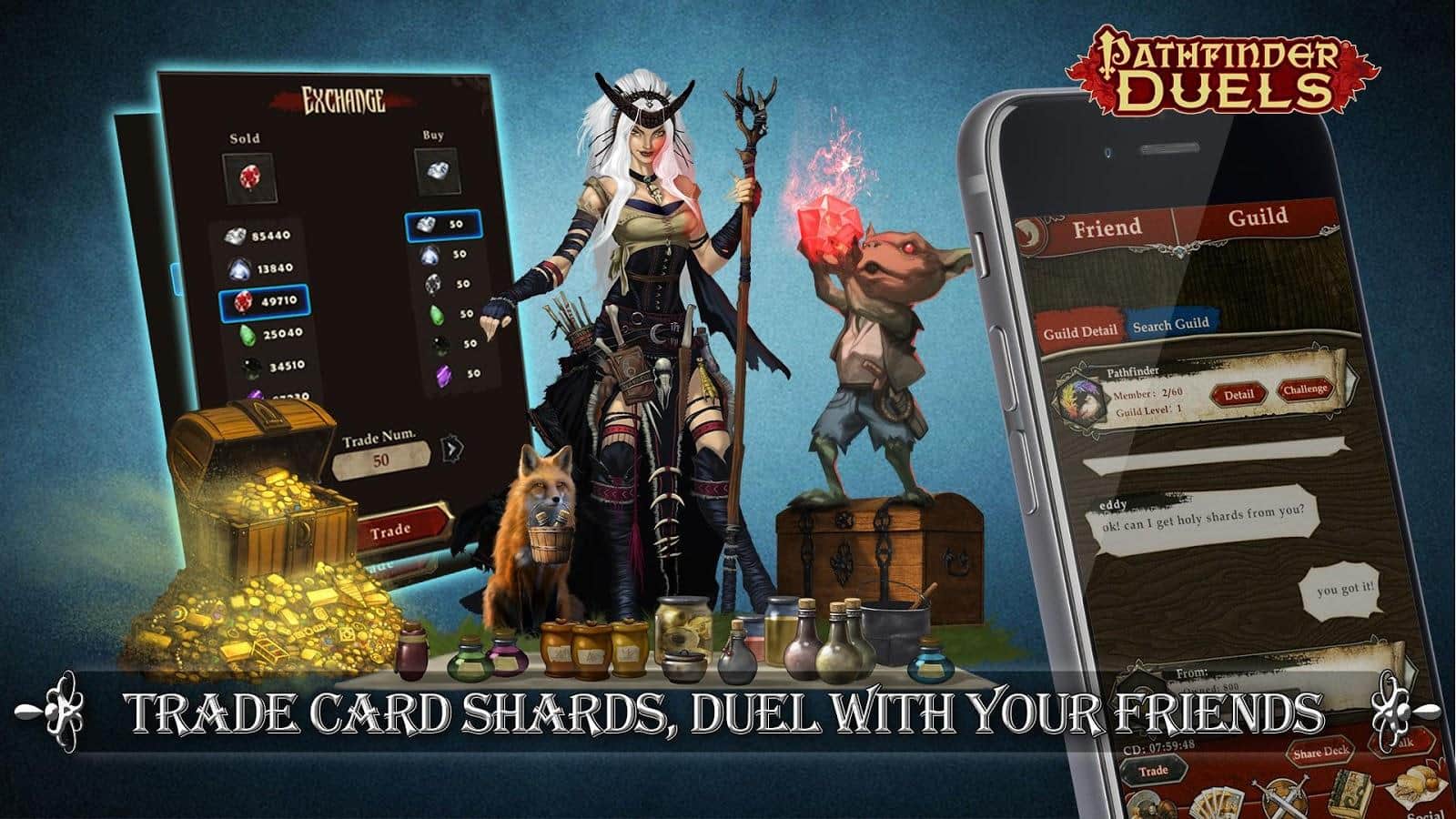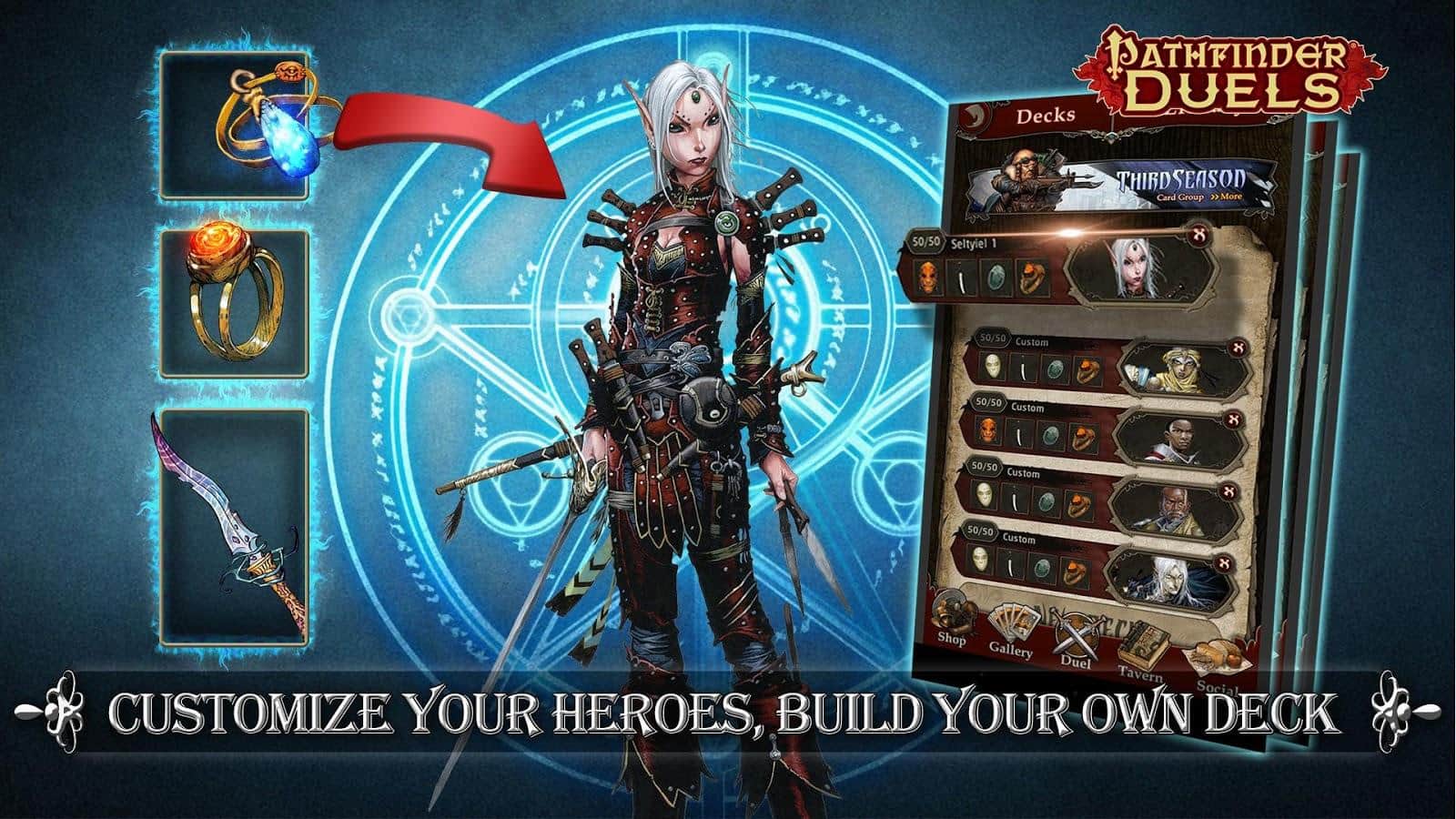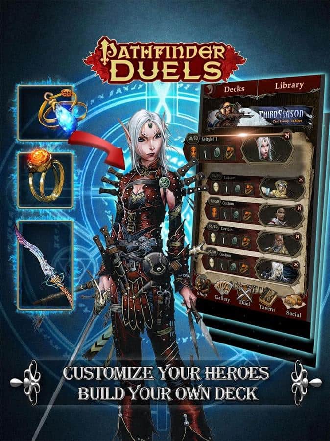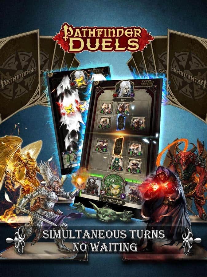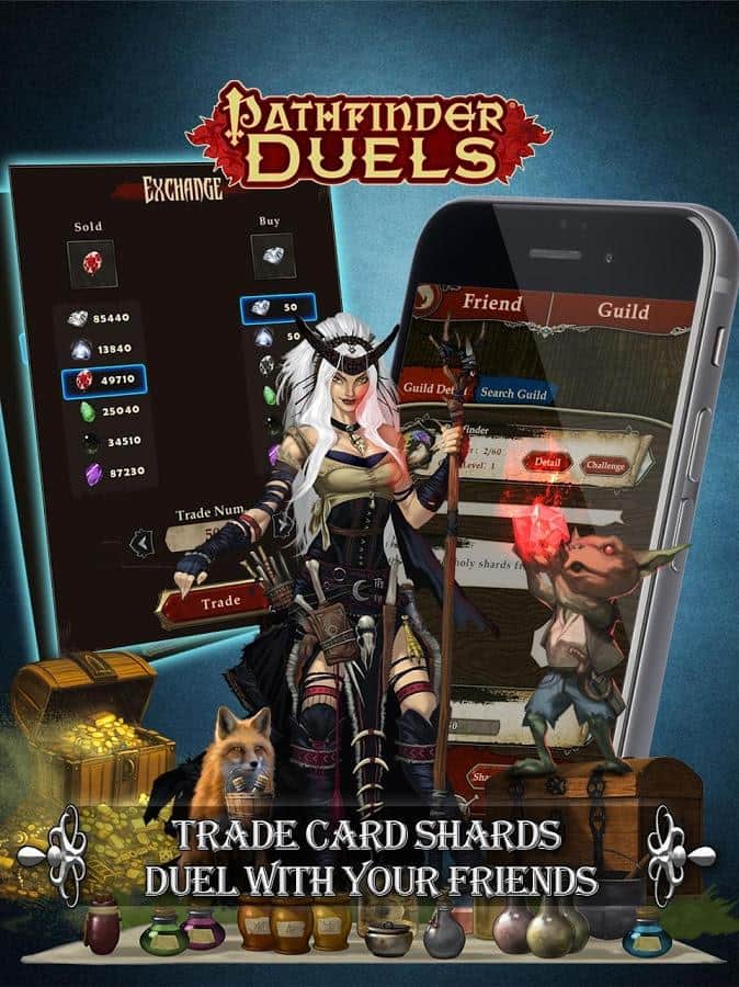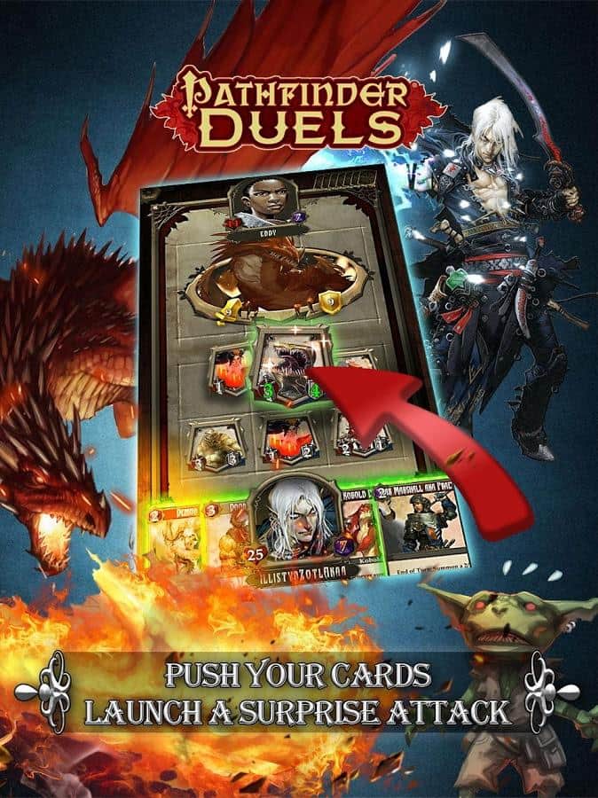 Pathfinder Duels es un juego de cartas para Android donde lucharás contra numerosos enemigos. Reúne tu mazo imbatible de cartas y enfrenta a los enemigos en el campo de batalla, mostrando todas las habilidades de tus héroes. Desarrolla una estrategia de juego para engañar a un oponente y llevarlo a una esquina. Reúne tu mazo de héroes legendarios y embárcate en una emocionante aventura. Obtén materiales valiosos a través de las luchas con enemigos y cámbialos por cartas poderosas. Invoca dragones poderosos para luchar a tu lado que absorberán el fuego de rabia del enemigo.