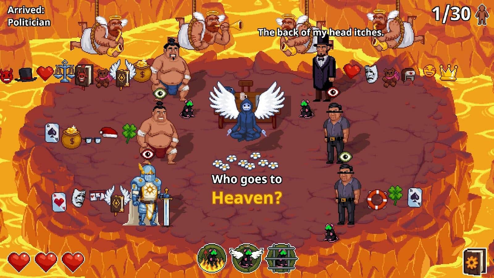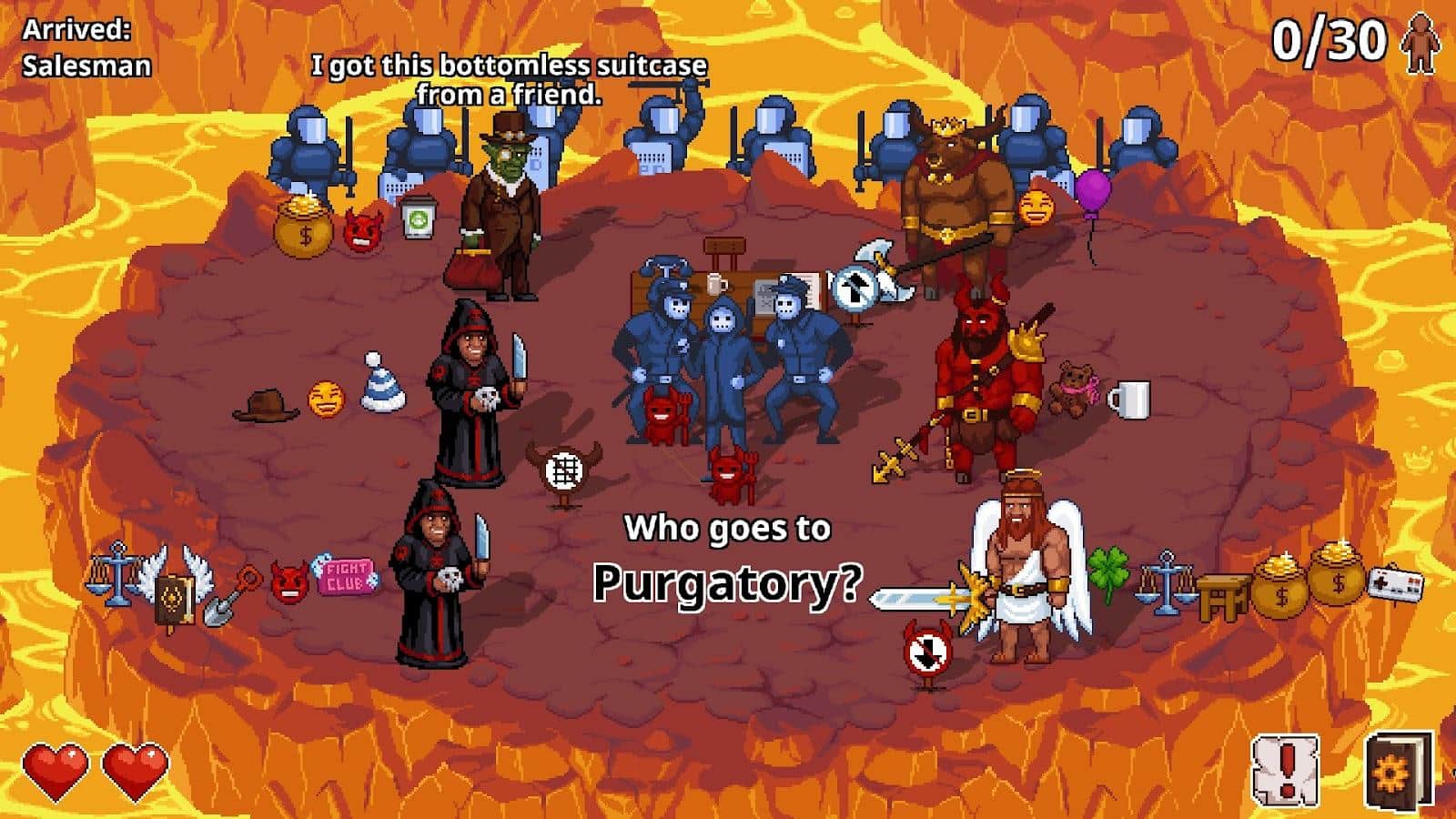 Distribuye clientes en función de una variedad de criterios diferentes a los tres lados: Infierno, Cielo y Purgatorio. Los clientes astutos interactúan entre sí, obstaculizan al Segador, ignoran las reglas estándar, lo que requiere estar muy atento antes de distribuir casi a cada cliente.