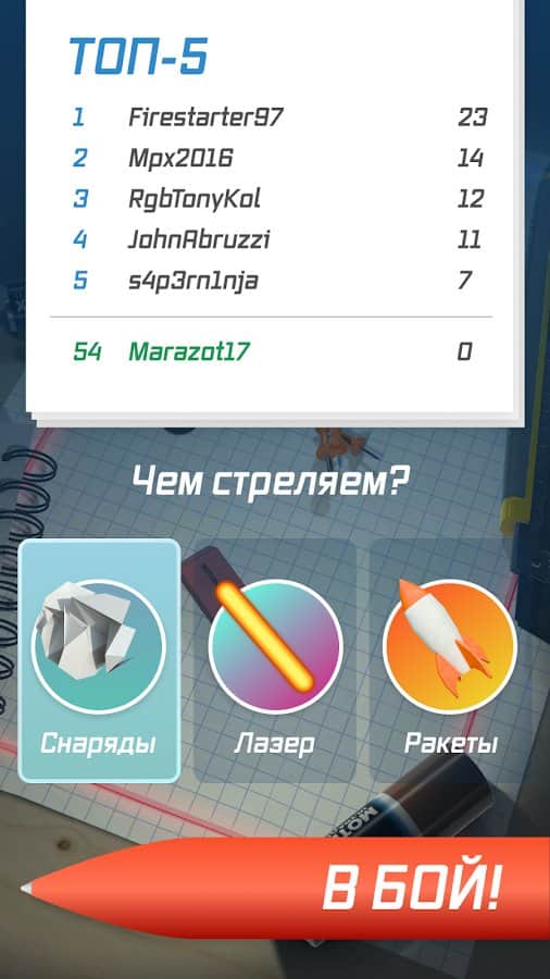 PENBOOM – una fascinante estrategia para Android, que te lleva a tu infancia, donde puedes jugar a Tanchiki en papel. Desafía a jugadores experimentados de todo el mundo y lucha en la arena improvisada, dibujada a mano. Toma el control de tu tanque y dispara al enemigo, tratando de derribarlo más rápido de lo que él lo hará primero. Durante el juego, mejora tu tanque, añadiendo armadura potente, mejorando la torre y desbloqueando nuevas armas. Desarrolla una estrategia de combate y juega con jugadores reales en batallas multijugador. Expande la Gran batalla por recompensas valiosas.