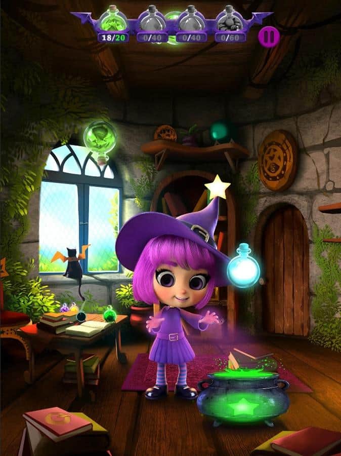 Poción Perfecta - En este juego has solicitado la ayuda de la pequeña bruja llamada Minerva y su gato mascota. Minerva quiere convertirse en la bruja más famosa que hace los caramelos más deliciosos en todo el Reino Mágico. Pero para aprender a hacer caramelos, una joven bruja necesita aprender y preparar todas las pociones de sus libros mágicos, ¡pero no puede hacerlo sin tu ayuda!